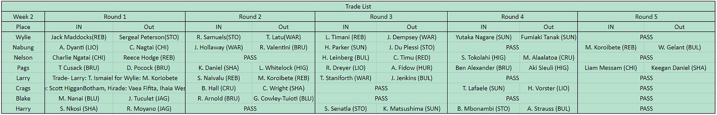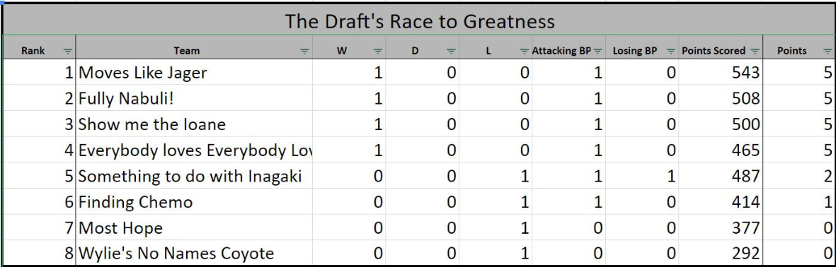 We round the matchups out with Fully Nabuli Blake taking on Something to do with Inagaki in what was the most competitive head to head game of the round. Similarly to years gone by, Blake took the win and pags found a way to lose (with a couple of BPs mind you) 508 (2) to 487 (4th). Blake had SP Marais (75), the Rookie Gatland (53), Naisarani (51) and surprisingly Marx (50) to thank for the tight win. While Pags would have wanted more from SBW (16) and Retallick (15) to go along with big scores from Izzy (70), Todd (61) and Coetzee (60).