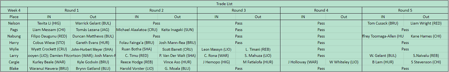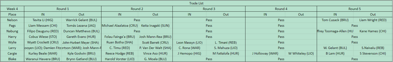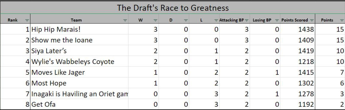 Our 3rd game was a tighter match as Blake Palmer took the BP win over Harrison Dale after trailing on the prelims. Huge scores from the Hulk, Esterheizen (70pts), Nanai 53pts, and Marx 50pts. The biggest point of difference though was in his backrow where Squire (59pts), Naisarani (52pts) & Taufua (33pts) demolished Matera (27pts), Kwagga (21pts) & Evans (18pts). Harry did take home two BP's though to give him some comfort after strong scores from Naholo (68pts), Van der Merwe 67pts & Matsushima 61pts. Again an inability to start the right time hurt him with two poor coaching decisions leaving Nkosi and Goodhue scoring solidly on the bench. The loss also pushes Harry back into the bottom 4 for the first time in at least recent memory.
