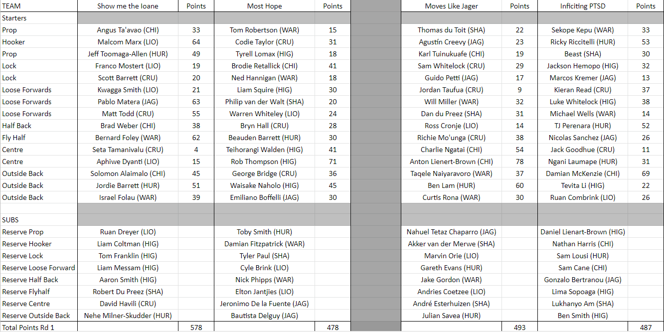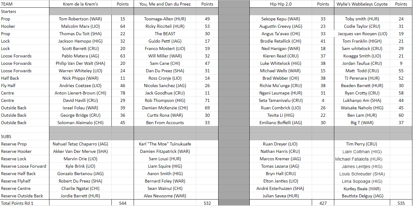 The top performing Coyotes were BLAM (61pts) and Folau (45pts), the rest forgot to turn up. His move of picking all the Hurricanes first was as bad as Nelson's similar move with the Waratahs and Pags' move to take Wylies hooker paid dividends.