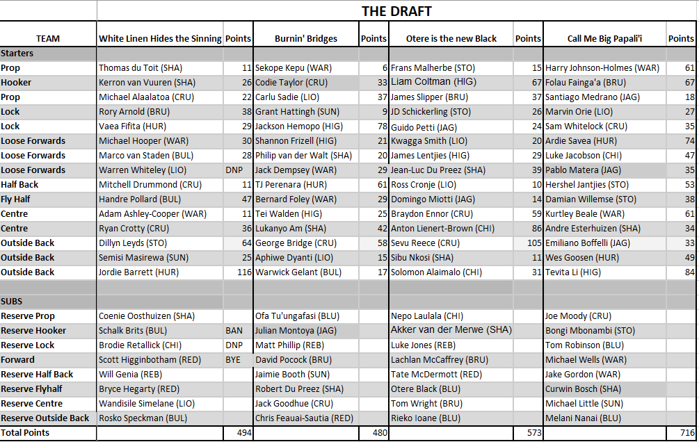 Larry is in a deep deep whole, once again he comes away with no competition points, and the lowest score of the round. It's only going to get harder from here, with the threat of a sexy calendar looming over his head, he will no doubt be upping his time in the gym instead of studying the Draft Rugby form guides. Clan McKenzie battled away this week, but at least he had Tom Franklin (80 points) playing out of his skin. Throw in some solid scores from Tyrel Lomax (48) and Curtis Rona (41) and there are a few bright sparks left in his side. Nelson will have you know that his team "Otere is the new Black" has the 2nd highest 3 round average in the OG League. His hot run of form can be described in two words, "Sevu Reece" (105 points), he has Hulk smashed his competition every week he has started, and now he looks to be have pushed his case for a regular starting spot. Anton Lienert-Brown (86) is in some insane form, as is Liam Coltman (67) and Braydon Ennor (59). It's hard to imagine Nelson not climbing into the top 4 soon if his 'Saders keep starting. To top it off, this weeks win takes him to 2 zip in the head to head.