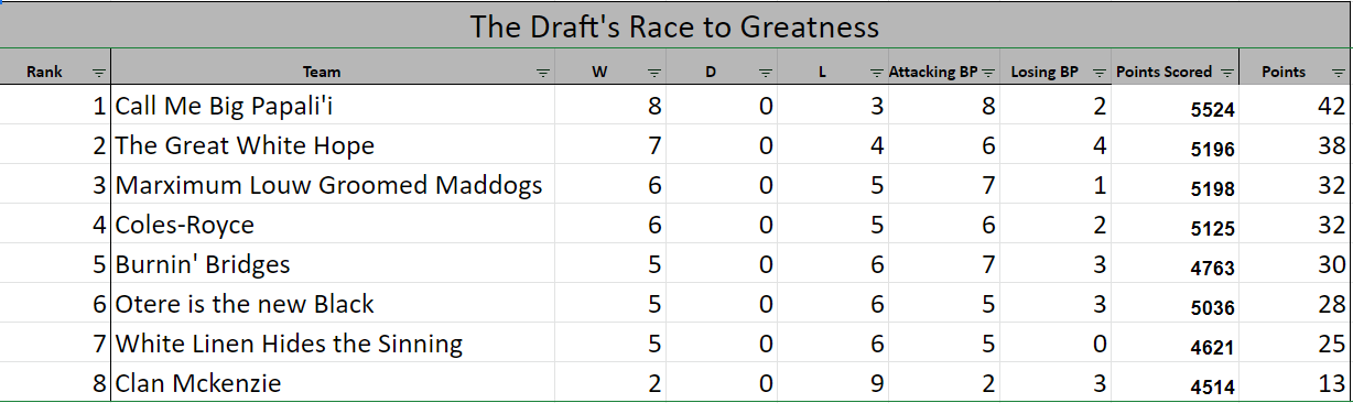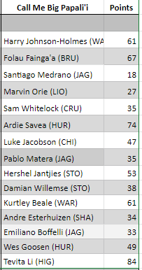 716!!! The biggest score of the year by 102 points, and also the BIGGEST SCORE EVER in Draft Rugby! This week Wylie had his chance to take down the man who stole his spot on the top of the log, but it definitely didn't go to plan. I could list all Call Me Big Papali'i's good scores but it would be easier just to paste the lineup here. Meanwhile, Wylie only fielded 13 players, so he was never really in the fight. Duane Vermeulen (55 points) top scored for the 2019 Charger, while Lizo Gqoboka (50), Beauden Barrett (48) and Damian Fitzpatrick (46) also scored well. Wylie has gone from a finals favourite to having the battlers nipping at his heels, fielding a full team should be an absolute must from here on in. The big win for Harry levels up the head to head at 1-1.