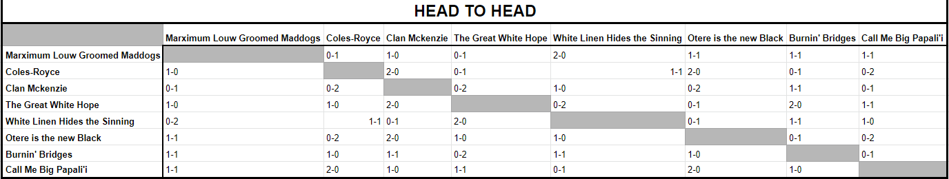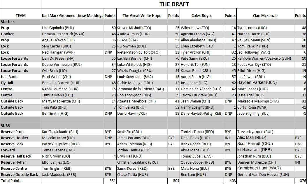 When you draw Nsync's (insert not punny random long name) you generally think the win is all but locked in. Cargie thought he could play down an outside back, but the plan backfired when Sean Wainui got pulled pregame with a hip injury to shatter his outside backs. In the end only Henry Speight (1 point) took played in the backfield for Coles-Royce. Josh Ioane (62 points) continues his rich vein of form since getting the 10 jersey back, while his halves partner Aaron Smith (57) also went big. His front row delivered through Allan Alaalatoa (47) and Agustin Creevy (41), but that's where the good times ended. Nsync has languished at the bottom of the table for most of the season, but things are starting to look up for the Rugby League fan. His win brings him within 7 points of both 3rd and 4th place, and with that, his finals chances are well and truly alive. Nsync had the Fantasy Man of the Round to thank for the win, Jordie Barrett (116 points). Dillyn Leyds (64) and Handre Pollard (47) also did their part, but there is no doubt he needs Hooper (30) and Semisi Masirewa (25) to pick their form back up. After two matchups the pair have split the points for 1 win each.