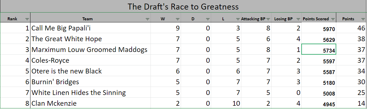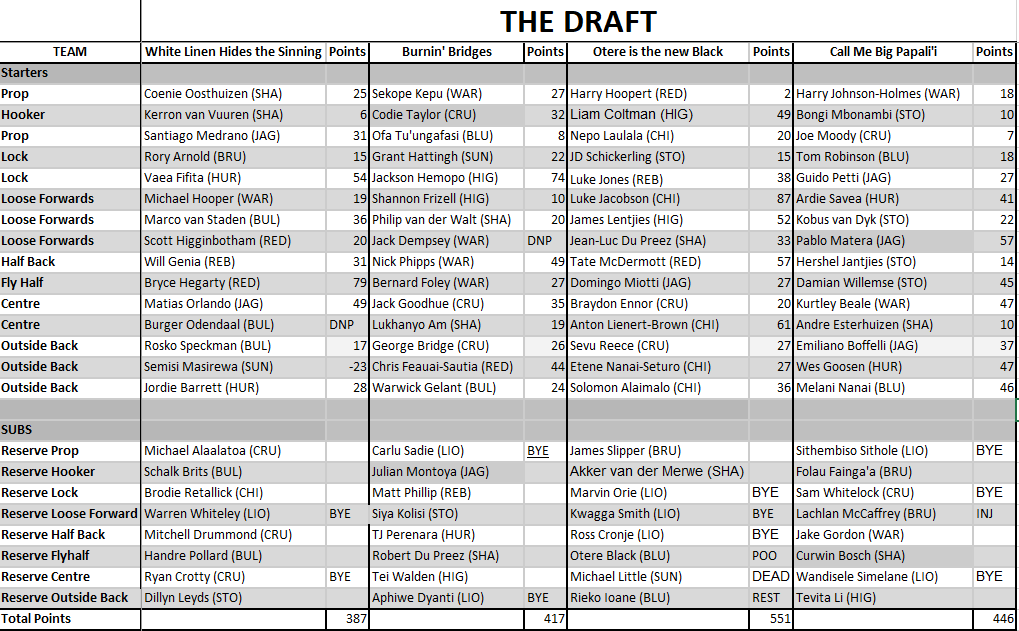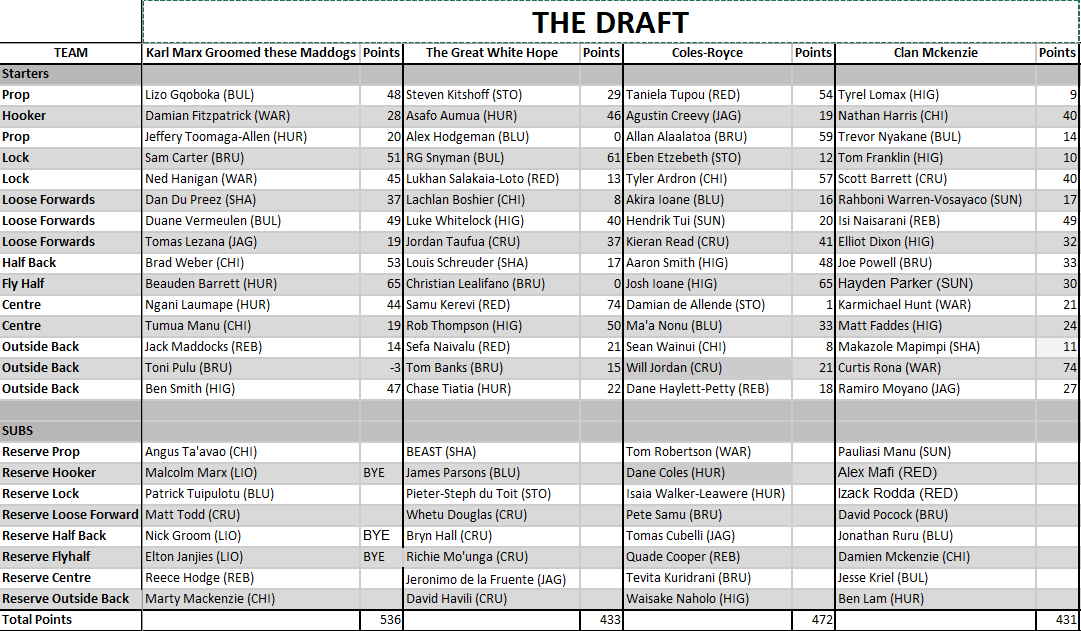 Wylie finally broke his run of 3 losses with the a bonus point win over 2nd placed Blake, closing the gap on the table to only 1 competition point. Toni Pulu (-3) may have been a complete dud this week, but Wylie more than made up for it through the worlds best player Beauden Barrett (65 points). Brad Weber (53), Sam Carter (41), Lizo Gqoboka (48), Ben Smith (47), Ned Hanigan (45) AND Ngani Laumape (44) all scoring solidly. It only takes one loss and you're back with the pack. This week Blake scored a respectable 433 but took home no competition points, the loss leaving him only 8 points from 6th place! Samu Kerevi (74 points) was the shining light for The Great White Hope, while RG Snyman (61) and Rob Thompson (50) also went large. Toss in Asafo Aumua (46) and Luke Whitelock (40) and you have a performance that would have expected at least a bonus point. Wylie's win makes it 1-1 in the head to heads between Blake and Wylie.