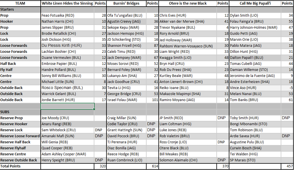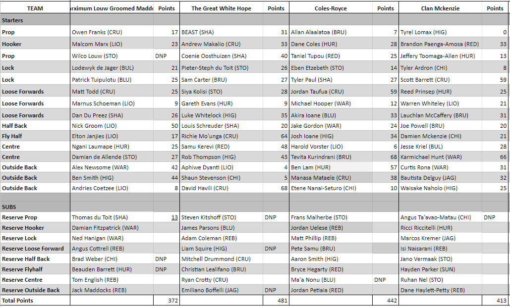 Another week and another come from behind victory for Blake's Great White Hope. Down 53 points after prelims, he has overturned a bigger deficit than last week through a return to form for David Havili (68 points) and Richie Mo'unga (64 points) two push himself up to second on the overall table. The centre pairing of Kerevi (48) and Rob Thompson (43) also contributed handsomely despite an injury to the latter. Larry's Clan McKenzie had a real crack this week, but it wasn't enough. Karmichael Hunt (66 points) seems to be in a rich vein of form for the spluttering Waratah's and Scott Barrett (59) had the game of his life. In the end he couldn't cover for his props Lomax (0) and Jeffery Toomaga-Allen (13) absence, or Ardron's (8) injury. The loss pushing him back into 6th position. This one was close, but it still reads Blake 1 - Larry 0.