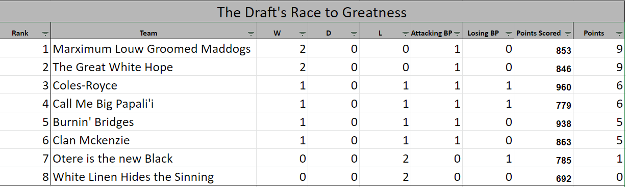 The Prelim's had Nelson's Otere is the new Blacks in the lead 250 points to 186 but as we found out in week 1, prelims don't mean smack! Wylie turned it all around to knock him down a peg 372 - 370, and with it he took the overall lead after two weeks of draft rugby. Wylie should consider himself lucky tacking a win by only 2pts, and with the 3rd lowest score of the week. The few points he did get came largely from Nic Groom (50pts) of all people, 'The Accountant' Ben Smith (44) and Alex Newsome (42). Dishonourable mention to Schoeman (6) who started despite the return of Kwagga, but still didn't score as many points as you'd expect had he come off the bench. It wasn't all bad for Nelson, as last years wooden spooners bagged a bonus point to rise all the way up the ranks to 7th! No one bagged a 50 here, but Kurtley Beale and Kwagga Smith (48 points each) on their returns, did combine well with Akker van der Merwe (41) to put some points on the board. Reiko Ioane (8pts, and an average of 15pts after two rounds) is in the running to be the biggest disappointment of the year to date, but in the end Nelson only had himself to blame after trading out Jordan Taufua (59) for