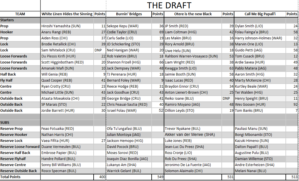 Round 5 was potentially the most controversial round of all times. The cancelling of the Highlanders V Crusaders games due to the Christchurch shooting tragedy mean't organising a way to deal with those players. We have discussed how we went about dealing with this issue here. Our thoughts go out to all the families and people involved in the shooting.