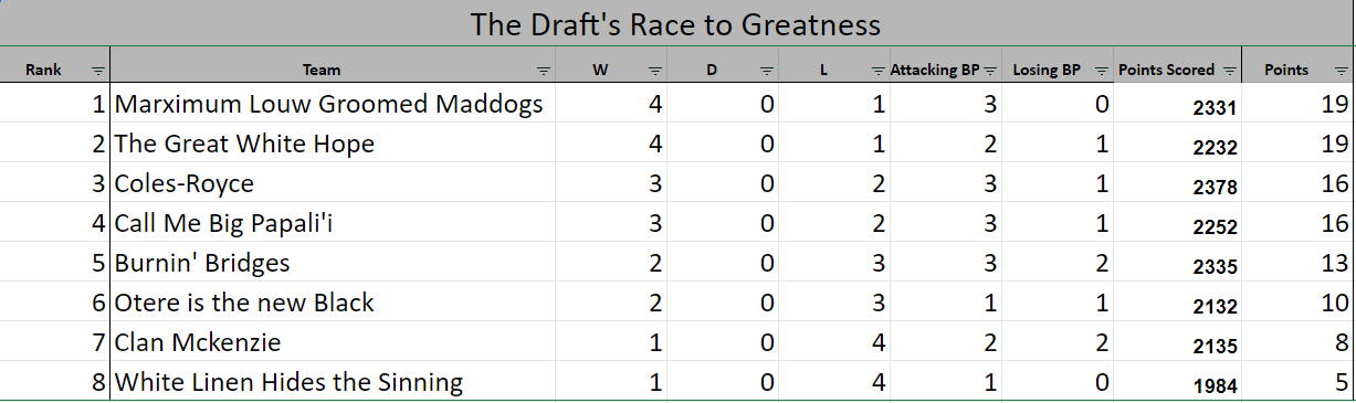 The King is dead! It took 5 weeks but finally there are no more undefeated managers in the OG League. The Great White Hope WENT TO TOWN on Wylie's Marximum Lo... etc. to belt him by 119 points. Blake bags a bonus point win and jumps to 2nd place on the table thanks to big performances from Samu Kerevi & Chase Titia (58 points each), Siya Kolisi (57) and Courtnall Skosan (54). Wylie's men left with no points after only Malcolm Marx (64 points) and Beauden Barrett (62) showed up this week. Liam Mitchell (3) off the bench was an obvious misfire from the competition leader, and Sean Wainui (19) is another for him to worry over. Blake holds it over Wylie in 2019 1-0.