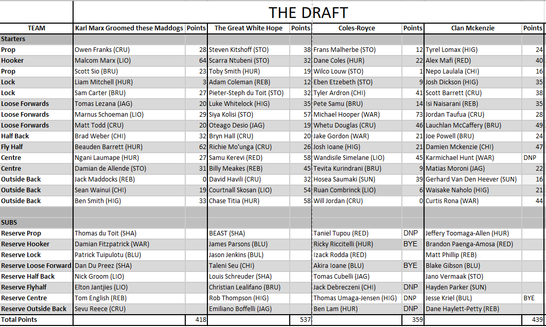 The battle of the names was on this week as Harry took on Larry (Loser Harry). They say derbies are worth double points, and that well and truly rung true in this match up, Harry ended up with the chocolates and extended his lead over Larry to 8 competition points. Call Me Big Papali'i was rocks and diamonds this week with new man Wes Goosen (92 points) taking out the fantasy player of the week, a trade he will be bragging about for some time given he originally picked up and then dropped the Barracuda instead. Folau Fainga'a (58) also scored a double but some how dropped from a 91 point prelim, and his forwards Petti (58), Savea (49) and Matera (48) combined well to bump up his score. The performance of the Brumbies trio Tom Cusack (12), and double outside backs Speight (11) and Banks (7) will create most of his headaches, especially with he Brums on a bye in round 7. Larry played this one a man down with Karmichael Hunt being a late withdrawal and only Kriel on a bye on his bench. Never the less his score was made respectable through Lachlan McCaffrey (49 points), a return to form for D Mac (47) at fullback, super sub Curtis Rona (44) and Alex Mafi (40). Harry leads Larry 1-0.
