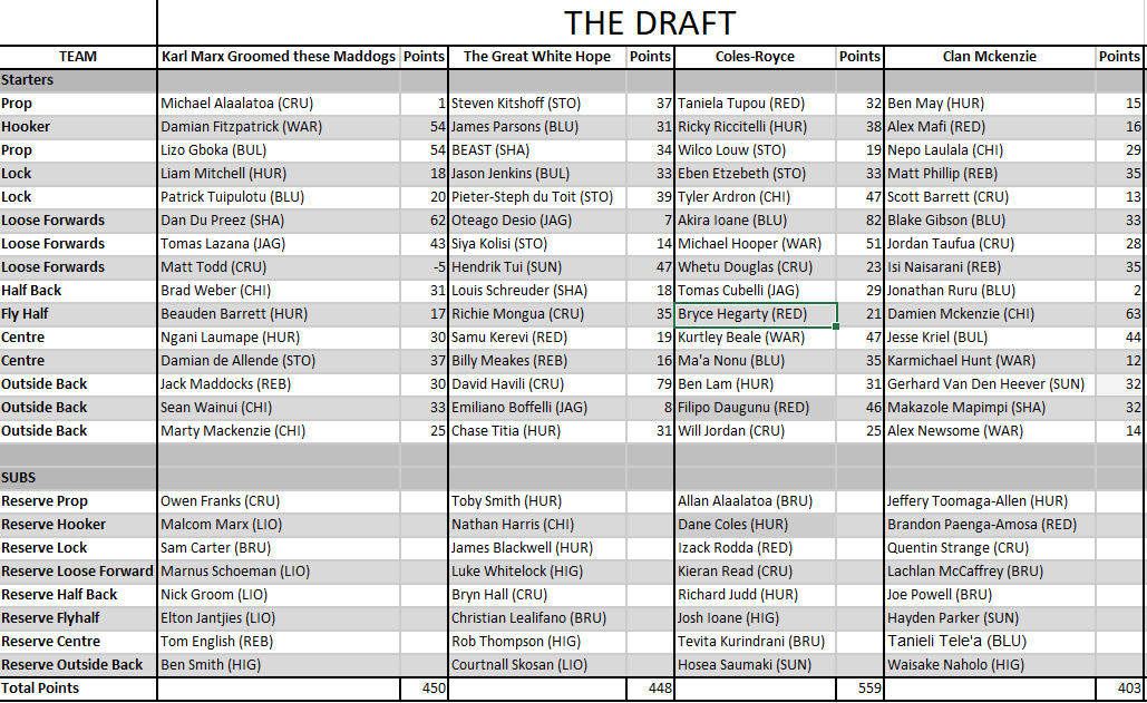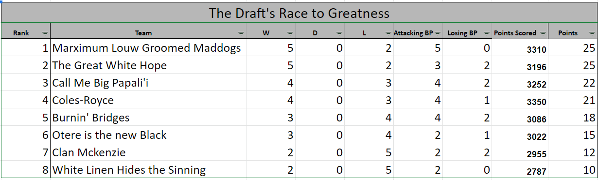It is the week of the underdogs! This week all 4 lower ranked managers took the win but lets start with Cargie's Coles-Royce as they took apart Wylies Marximum Louw Groomed Maddogs. Cargie's bonus point win came through Akira Ioane (82 points), Michael Hooper (51), Kurtley Beale (47), Tyler Ardron (47) and Filipo Daugunu (46). In contrast, Wylie scraped an attacking bonus point on EXACTLY 450! Matt Todd (-5) was no help, but Dan du Preez (62), Damian Fitzpatrick and Lizo Gqoboka (54) all showed up to keep him on top of the table on total points alone. This one finishes with Cargie 1 - Wylie 0.