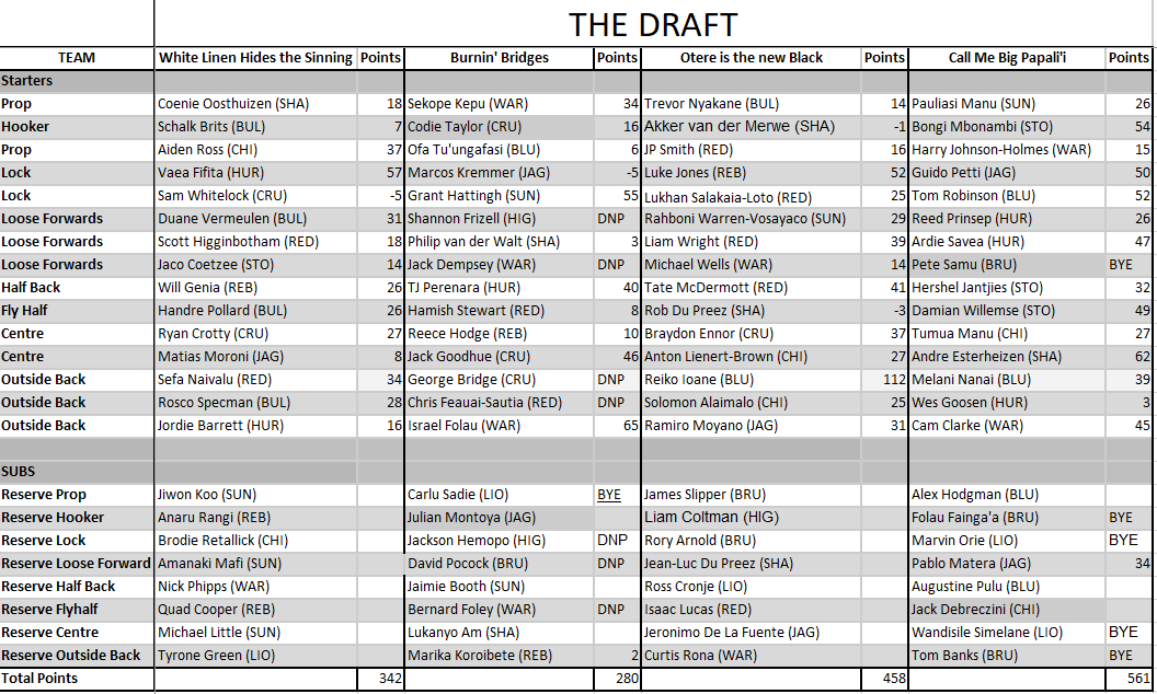 This is what we all tune in for, 8th placed Larry (Loser Harry) taking on 7th placed Nsync, the interest in this match is absolutely fizzing! My favourite fact here is that Larry defeated Nsync with the 3rd and 2nd lowest score of the week, a true battle of the giants! Damien McKenzie (63 points) was fire again, and Jesse Kriel (44) continued his rich vein of form. On the other end Sam Whitelock (-5) fell to pieces this week, while Vaea Fifita (57 points) was the only one that really showed up for Nsync. Not much else to talk about here, Larry holds it 1 - 0 over Nsync.