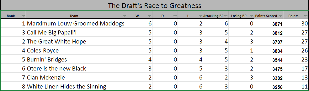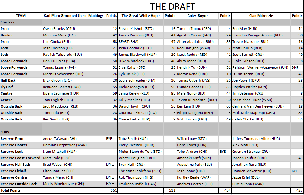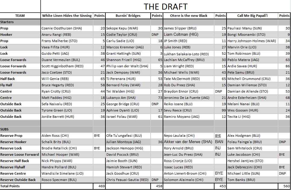 In week 8 the rich got richer as 4 of the top 5 took out wins, what's more, the top score went to none other than front runner Wylie, as Marximum Louw Groomed Maddogs scored 561 points to extend his lead to 3 competitions points over his nearest rivals. This was always touted as David versus Goliath, 1st versus 8th, the only caveat was that the Giant did it Easssyyyy! Nsync scored well through Halfback fantasy gold Will Genia (65 points) and bum come Mr consistency Bryce Hegarty (58). While Scott Higginbotham (47), Duane Vermeulen (46) and Ryan Crotty (44) also proved their worth. Sadly though, his solid free agent pick ups Malherbe (5) and Faddes (18) both failed to live up to the hype. Having had his time again, surely he would have picked up Sevu Reece (99) with his 1st round priority pick. Meanwhile Wylie went from strength to strength with Lizo Gqoboka (63 points) of all people top scoring. The prop has well and truly turned his own season around. Big scores also came from Ngani "the mini bus" Laumape (59), under fire Beauden Barrett (55), Dan "the lesser" du Preez (50), Patrick Tuipulotu (49) and Malcolm Marx (42). After 2 games, this one sits Wylie 2 - Nsync 0.