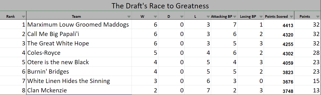 It's getting tight at the top! The bonus point win takes the top three on the table to the same competition points. The other side of the story has Larry (Loser Harry) slide back to 8th and last place. The Great White Hope continues to get maximum points out of Richie Mo'unga (74 points) and Samu Kerevi (67), while new man RG Snyman (69) was on fire as well. David Havili and Lachlan Boshier (59) scored solidly, with solid backup from Emiliano Boffelli (49). Larry's team is fading fast, he needs a big change to get more out of his starting lineup. The men that are worth something are Isi Naisarani (63 points) and Joe Powell (51), but that's where the positives end. Surely Alex Mafi (25), Lomax (10), Franklin (20), Combrinck (22) and Caleb Clarke (12) should all be on the chopping block. Blake has dominated Larry this year, and the match up shows 2 - 0 as a result.