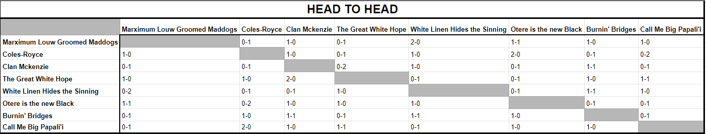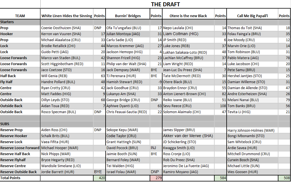 Let me introduce Nabung's "Burnin' the Bye Bridges". He fielded a 12 man team this week with two of those coming off the bench. Needless to say, Nsync had this one in the bag, all be it with out an attacking bonus point. The win lifts him off the table, and drops Nabung down to 6th place. Nsync's White Linen played with 13 men after being decimated through the week but still manged a dominant win through Dillyn Leyds (68 points), Will Genia (63) and Joe Powell (51). Meanwhile the heroics of Aphiwe Dyanti (63 points) wasn't enough to drag the Bye into a semi decent score. Pair this with Hamish Stewart (-9) and Jackson Hemopo (4) and you have one stanky team. Nsync's win ties the head to head 1 - 1.