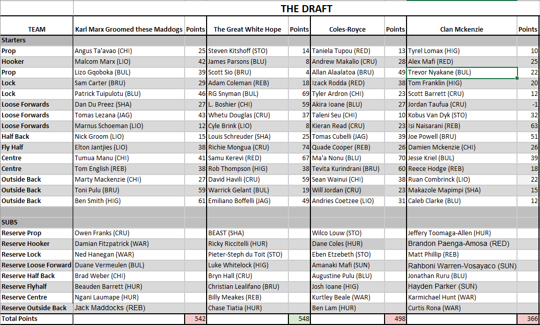 Otere is the new Black looked more like a fantasy dream team coming into this one, and they had to be with a match up against the competition front runner Wylie. The bonus point win brings Nelson up to 5th place, and within 5 competition points of fourth place Cargie who suffered his own loss this week. This one pretty much started and finished with Sevu Reece (108 points), dubbed 'the match up killer' by FRD he has been in an unseen vein of form. Anton Lienert-Brown (82) had another big game, as did Braydon Ennor (55), Reiko Ioane (51), Lukhan Salakaia-Loto (48) and Solomon Alaimalo (47). This marks the first time Nelson has bagged the biggest score of the week, something that he'll likely need to replicate several times over if he is to push himself back into finals contention. A tough loss for Wylie this week with the 3rd highest score of the round. Despite the loss he stays on top of the log based off total points alone, something that is only possible because of his 2 bonus point performance. Big games came through Ben Smith (61 points), as well as Toni Pulu (59), Patrick Tuipulotu (46), Tomas Lezana (43), Malcolm Marx (42) and Tumua Manu (41). Last years wooden spoon match up now sits at 1 a piece.