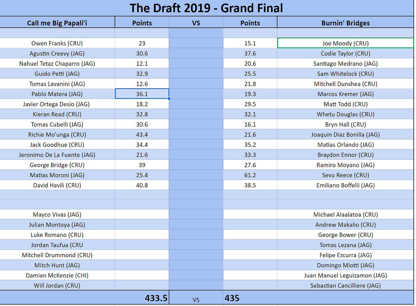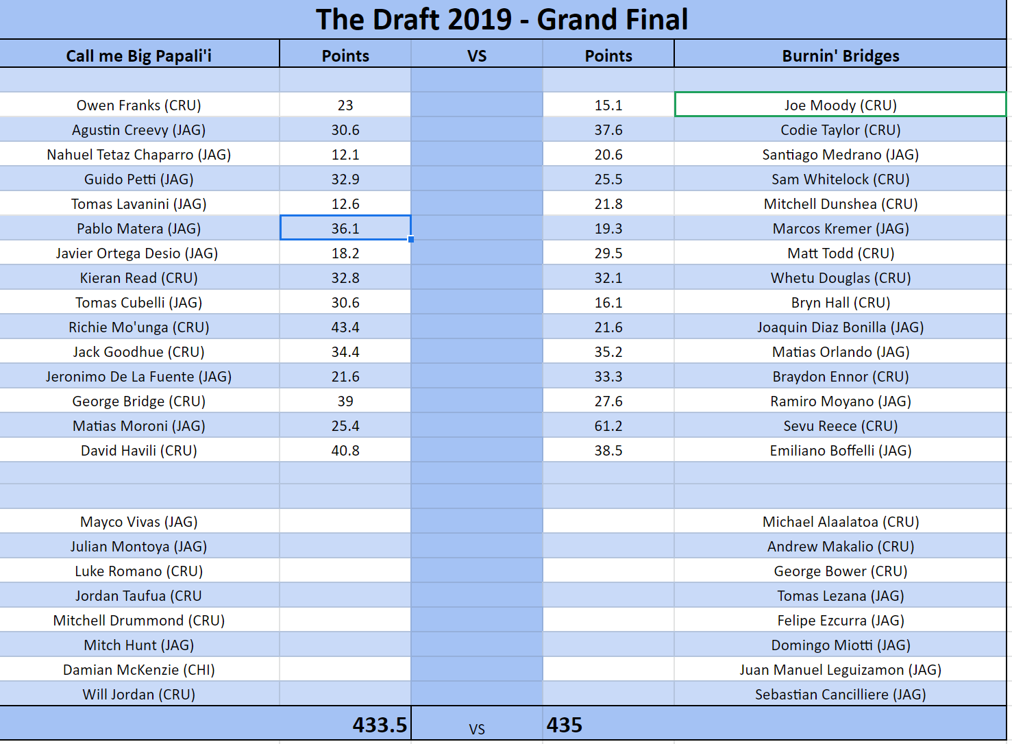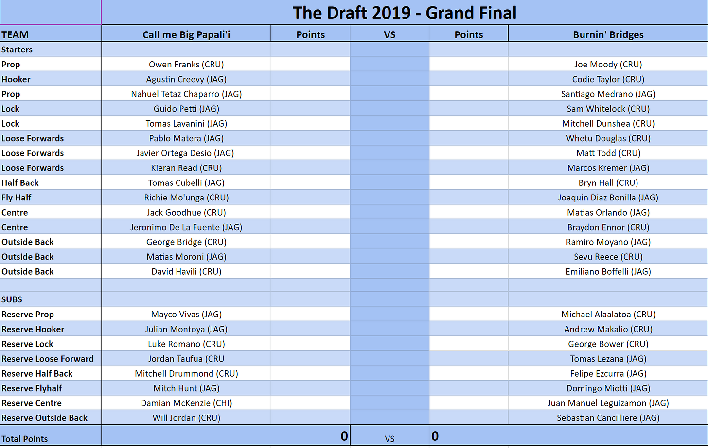 Picks:Drafter:Player:Pick 1Call me Big Papali'iRichie Mo'unga (CRU)Burnin' BridgesSevu Reece (CRU)Pick 2Call me Big Papali'iPablo Matera (JAG)Burnin' BridgesBraydon Ennor (CRU)Pick 3Call me Big Papali'iDavid Havili (CRU)Burnin' BridgesCodie Taylor (CRU)Pick 4Call me Big Papali'iKieran Read (CRU)Burnin' BridgesMatt Todd (CRU)Pick 5Call me Big Papali'iJack Goodhue (CRU)Burnin' BridgesMatias Orlando (JAG)Pick 6Call me Big Papali'iGuido Petti (JAG)Burnin' BridgesEmiliano Boffelli (JAG)Pick 7Call me Big Papali'iGeorge Bridge (CRU)Burnin' BridgesRamiro Moyano (JAG)Pick 8Call me Big Papali'iTomas Cubelli (JAG)Burnin' BridgesSam Whitelock (CRU)Pick 9Call me Big Papali'iAgustin Creevy (JAG)Burnin' BridgesJoaquin Diaz Bonilla (JAG)Pick 10Call me Big Papali'iMatias Moroni (JAG)Burnin' BridgesMitchell Dunshea (CRU)Pick 11Call me Big Papali'iJeronimo De La Fuente (JAG)Burnin' BridgesWhetu Douglas (CRU)Pick 12Call me Big Papali'iJavier Ortega Desio (JAG)Burnin' BridgesBryn Hall (CRU)Pick 13Call me Big Papali'iTomas Lavanini (JAG)Burnin' BridgesMarcos Kremer (JAG)Pick 14Call me Big Papali'iOwen Franks (CRU)Burnin' BridgesSantiago Medrano (JAG)Pick 15Call me Big Papali'iNahuel Tetaz Chaparro (JAG)Burnin' BridgesJoe Moody (CRU)Pick 16Call me Big Papali'iWill Jordan (CRU)Burnin' BridgesMichael Alaalatoa (CRU)Pick 17Call me Big Papali'iJordan Taufua (CRUBurnin' BridgesTomas Lezana (JAG)Pick 18Call me Big Papali'iJulian Montoya (JAG)Burnin' BridgesSebastian Cancilliere (JAG)Pick 19Call me Big Papali'iMitchell Drummond (CRU)Burnin' BridgesAndrew Makalio (CRU)Pick 20Call me Big Papali'iLuke Romano (CRU)Burnin' BridgesDomingo Miotti (JAG)Pick 21Call me Big Papali'iMayco Vivas (JAG)Burnin' BridgesFelipe Ezcurra (JAG)Pick 22Call me Big Papali'iDamian McKenzie (CHI)Burnin' BridgesJuan Manuel Leguizamon (JAG)Pick 23Call me Big Papali'iMitch Hunt (CRU)Burnin' BridgesGeorge Bower (CRU)