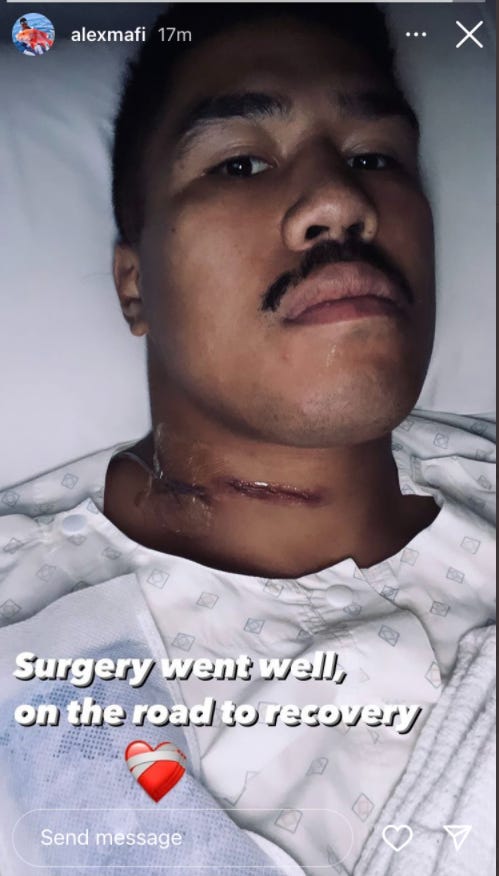 Alex Mafi - Had two bones in his neck fused after rd 3. Expected to be out for 12 weeks. We think it could end his season. Source.