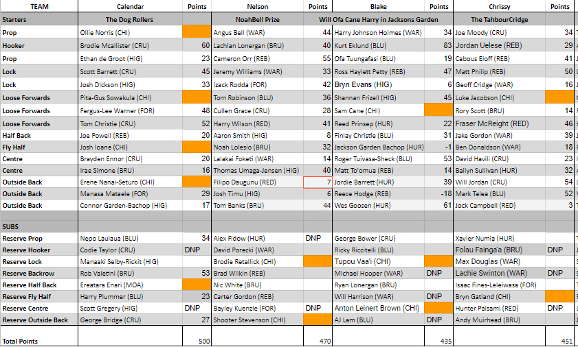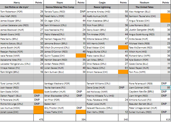 The Champ's TahbourCridge was on the build with top scores from the ever reliable and one of the best outside backs in the world Will Jordan (49 pts), the come good Mark Telea (43 pts) and the workhorse Boxer Matt Philip (39 pts). To match this, Nsync's players across the board scored solid Matt Todd 30s or there abouts to keep him in play. His top performers were Oli Jager (37 pts) JOC (34 pts) and Medrano (33 pts) showing props are doing well in this draft. Synca is still looking for his namesake and first pick Pablo Matera. Most likely singing Bye Bye Bye to the opportunity cost of points he could have got elsewhere.
