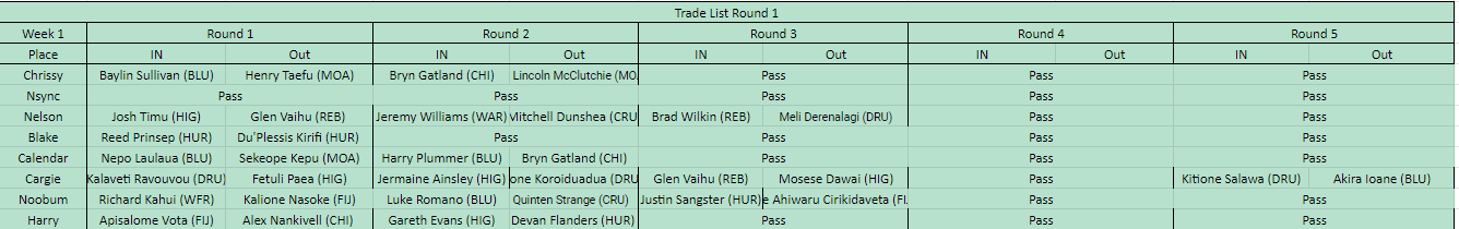 New Blake's team name which he needs to have a hard look at, had some cracker players with Kurt Ekland (65 pts), the in form Wes Goosen (52) and the league convert with a debut you couldn't ask more from except for making the final tackle which led to a Hurricanes win in Roger Tuivasa-Sheck (40 pts). You'd think scores like these would be enough but it was countered by the continuous poor form of Jackson Garden Bachop (-2 pts) and the horrible Reece Hodge (-23 pts) who got us asking whether this was the lowest fantasy score ever.
