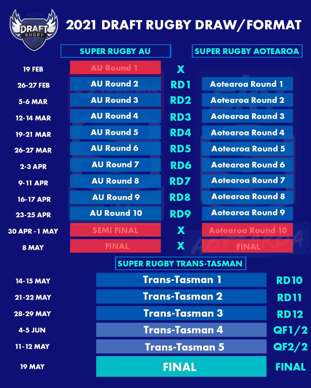 Draft Rugby will kick off the night before Super Rugby AU Rd2 & Aotearoa Rd 1 starts (on the 25th of February) with the following details: