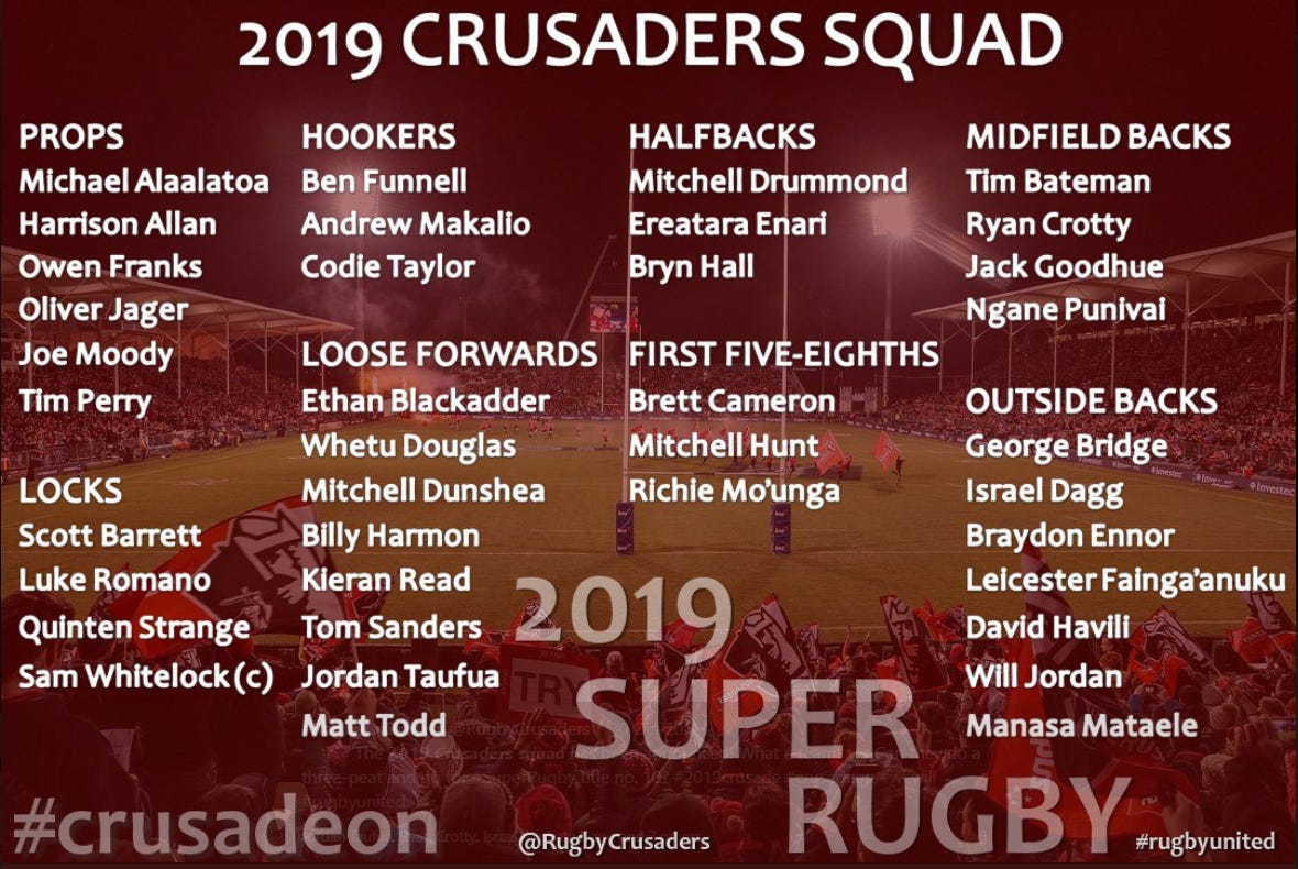 Joe Moody, Codie Taylor, Owen Franks, Scott Barrett, Sam Whitelock, Jordan Taufua, Matt Todd, Kieran Read, Bryn Hall, Richie Mo'unga, George Bridge, Ryan Crotty, Jack Goodhue, Manasa Mataele , David Havili