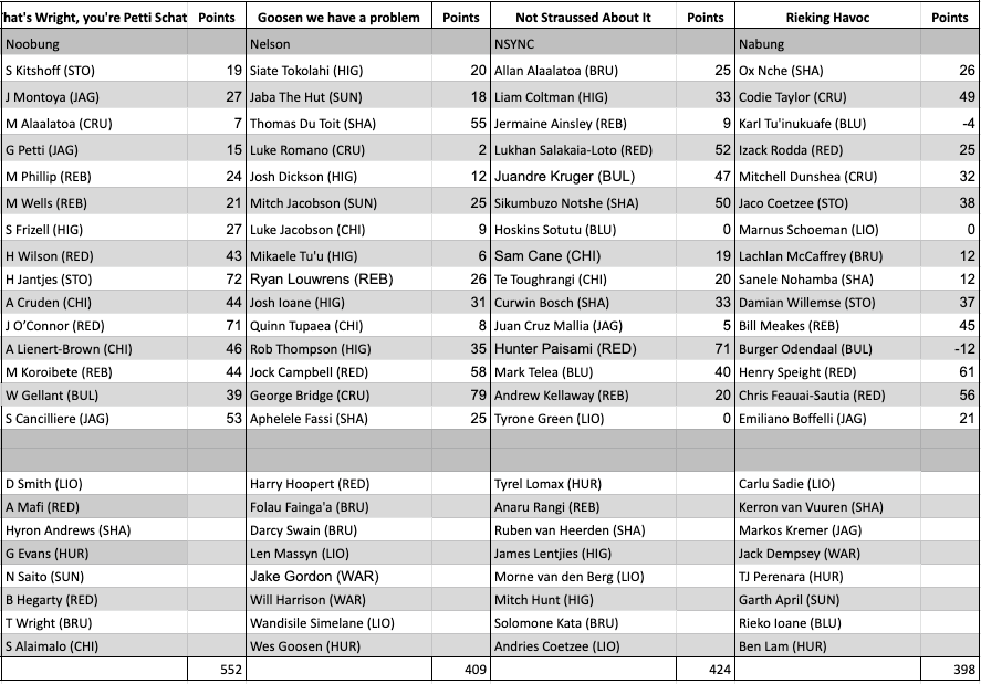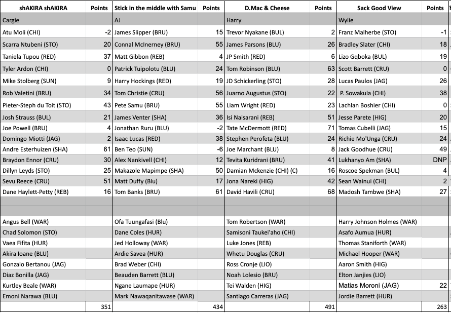 For Nabung there the men leading the charger were Billy Meakes (45pts), Codie Taylor (49pts) and Chris Feauai-Sautia (56pts). With only 47 points separating the two rivals, it was Nabung’s draft week pickup of Henry Speight which turned to gold for him, earning him 61 points. The result saw another tough defeat for Cargie who now finds himself at the bottom of the table - perhaps it may be time to give up on Akira Ioane…