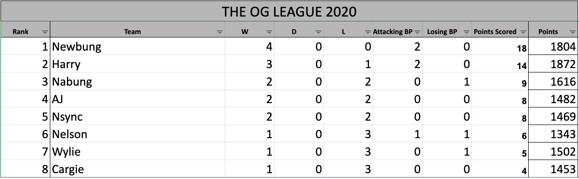 'Newbung' AKA younger Nabung or Christian Nabung has answered the SOS and stepped up to complete the OG League writeup for round 4 with the usual lads being a little swamped early on this week. Some have suggested newbung's eagerness for such generosity may have sprung from his current success and the opportunity to rub it into his fellow draft mates. Either way we much appreciate it and the man certainly can do no wrong in his rookie Draft Rugby and OG League season.