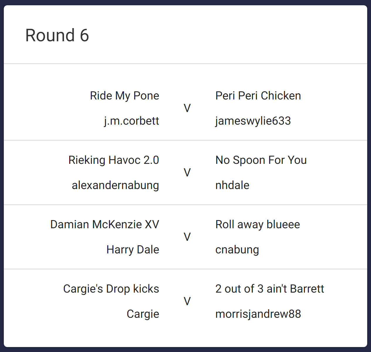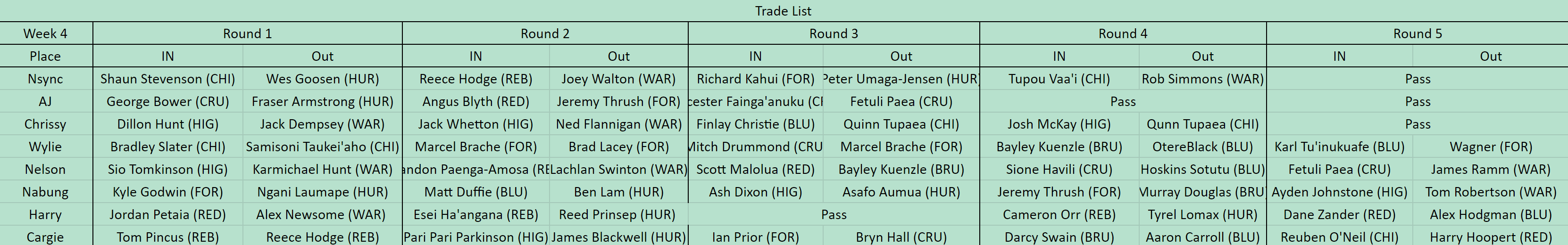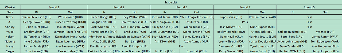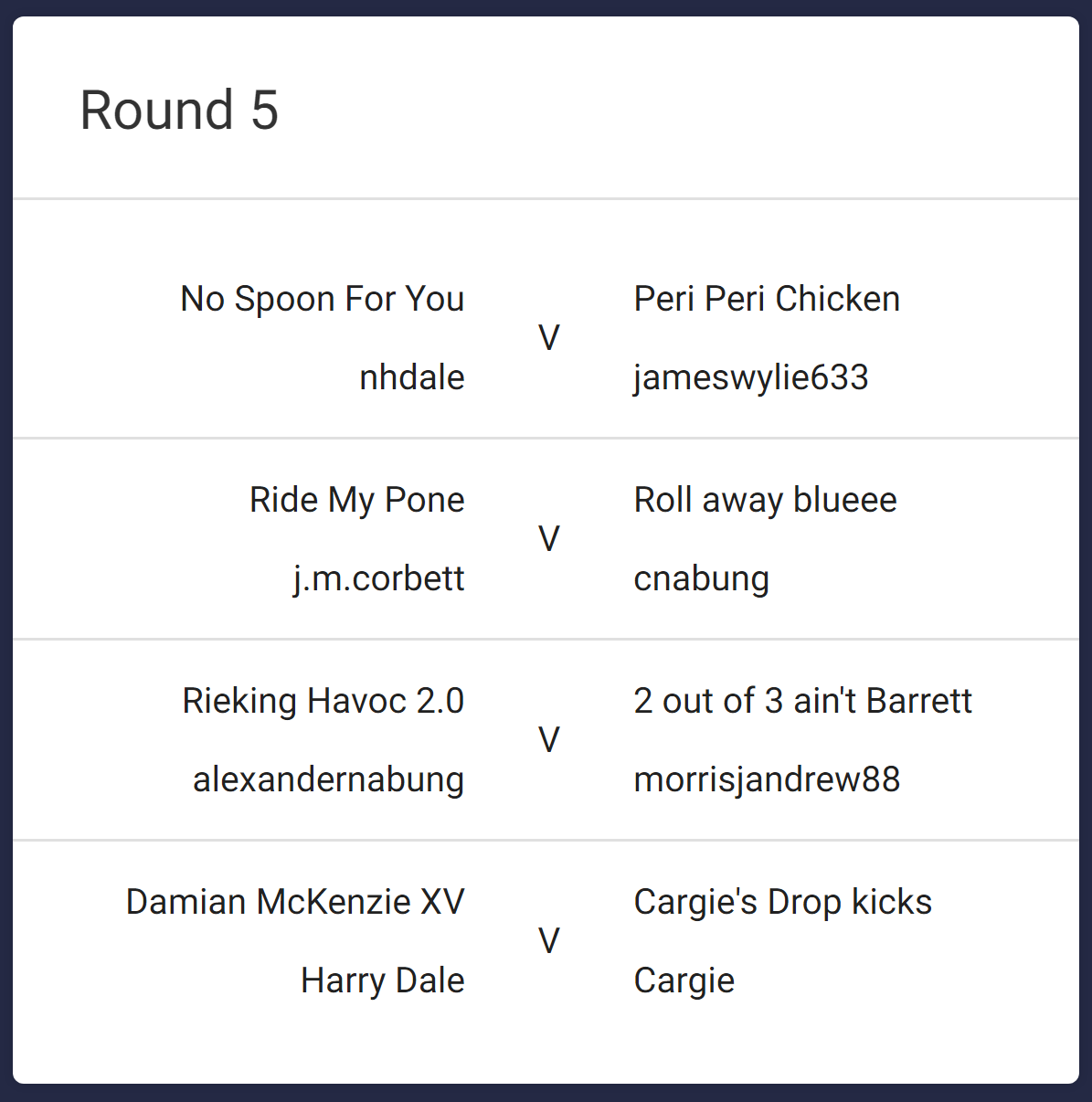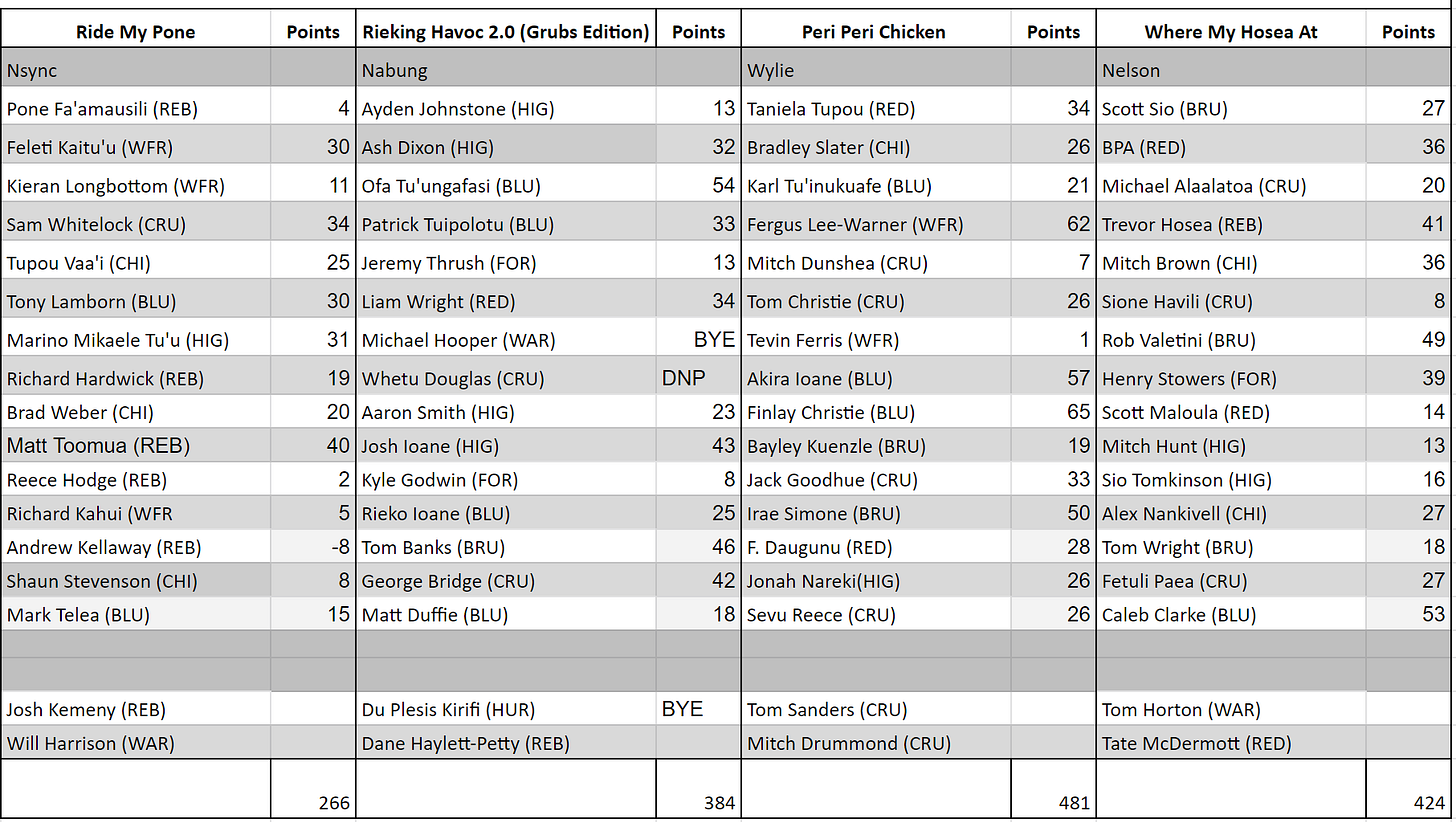 Nsync is the perfect example of what happens when you take a trade night off. Even though it was three weeks ago, it's meant he is scrambling to field any trash he can to field a full side. His five new men scoring a total of 59 points this week. Shout out to Matt Toomua (40 points) who was his only reasonable player. This week's loss now locks him in as our first manager playing for the spoon.
