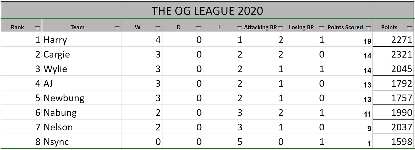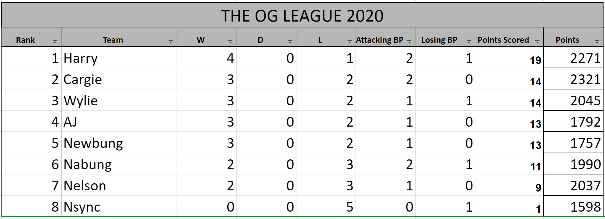The second installment of this mini-seasons OG League is here! With no changes to the Sunday night scores with later updates yet, we have decided to back that these scores will be final. Last week Nabung, Newbung, Wylie and Nelson all bagged wins. A special shout out to Nelson who knocked off his brother Harry by 21 points to end a 12 game losing run!