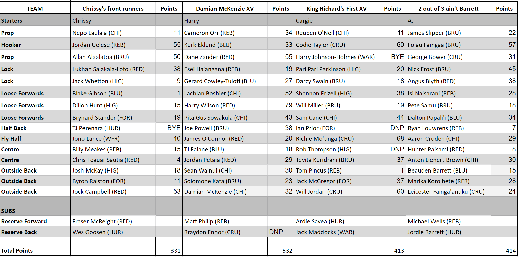 Cargie built his season run by picking players with the least byes. How then he fielded a team of only 12 players is lost on me, especially when of those is Tom Pincus (1). Despite taking this week very easily on his rival, his Crusaders trio of Richie Mo'unga (68 points), Codie Taylor and Will Jordan (60) went absolutely berserk yet again. It's just a Shame that no one else went with them. I'm fully expecting Cargie to go on a trading rampage this week to stack his team with many more of the championship side. Despite the loss, Cargie holds onto a spot in the top two off the back of his superior for and against, but there's no doubt he will need to win at least one of his remaining games against AJ or Nelson.