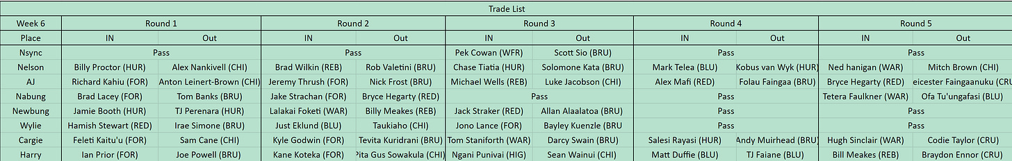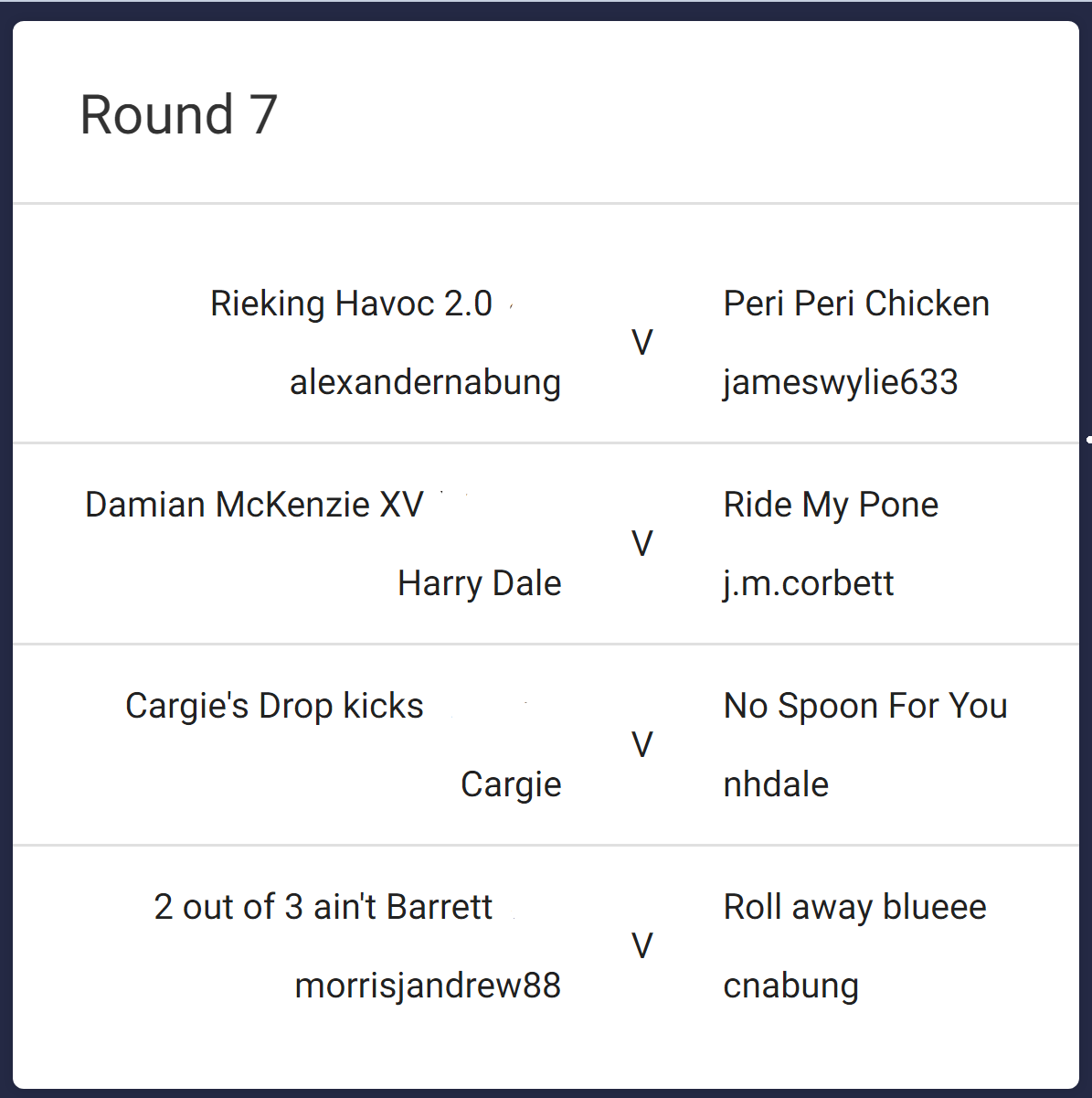 The incumbent OG League Wooden Spoon and spoon to be the back to back to back spoon, Nelson thought he might be in with a shot looking at his oppositions team sheet early in the week. I would say he talked a big game this week but he does every week and eyeballing Cargie's wealth of Crusaders that may be rested or the game being in doubt truly excited him. After Cargie pulled the trigger on some trades, he responded with some of his own but ultimately was only able to muster 13 players to get on the grass and put up scores this week. Nelson even had a bit of luck with pick up Chase Tiatia on the bench being promoted to a start on the wing with Wes Goosen pulled pregame illustrating the importance of your bench and using your trades. This said, you know you are in trouble when your top scorer is Michael Collins, mind you Collins did deliver a 76 point performance but after that apart from Tate McDermott returning to a start with 42 points, that is pretty much where the music stopped. Unlike his club footy team on the weekend, pulling off a win in the 89th minute, it wasn't to be for Where My Hosea At and nelson now faces the reality of finishing 7th on the table and confirming his participation in his 3rd wooden spoon playoff.