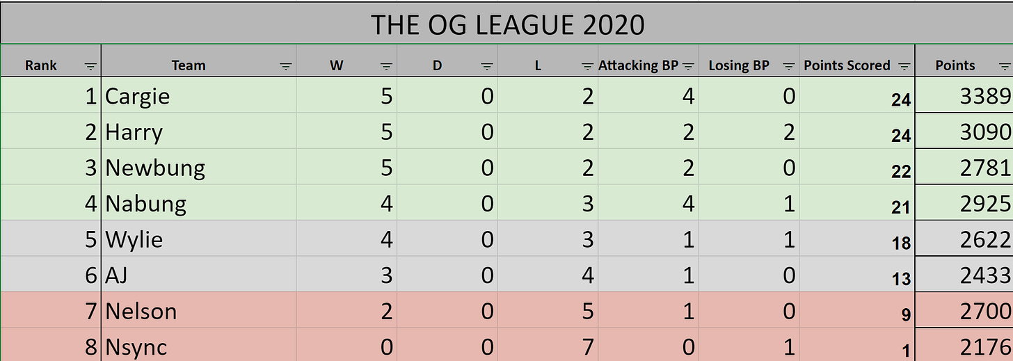 Both the OG Semi-finals, and the Wooden Spoon play-off will be played over two consecutive weeks, with a complete redraft of teams for both rounds. The managers with the highest cumulative scores will progress to the grand final or avoid the dreaded spoon respectively.