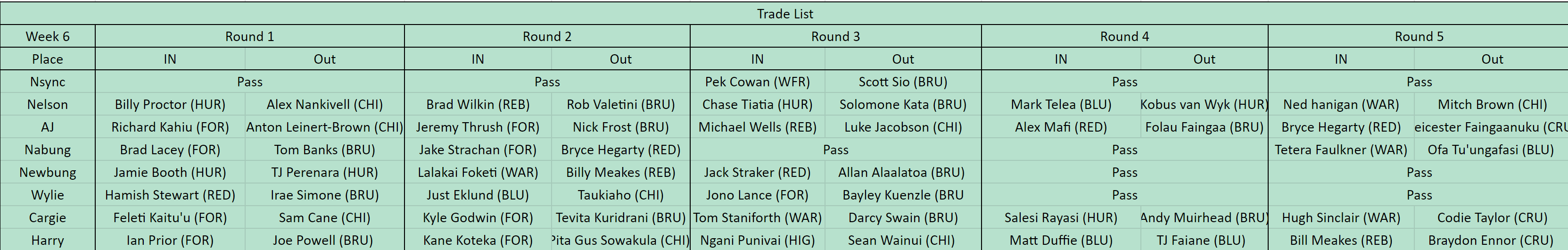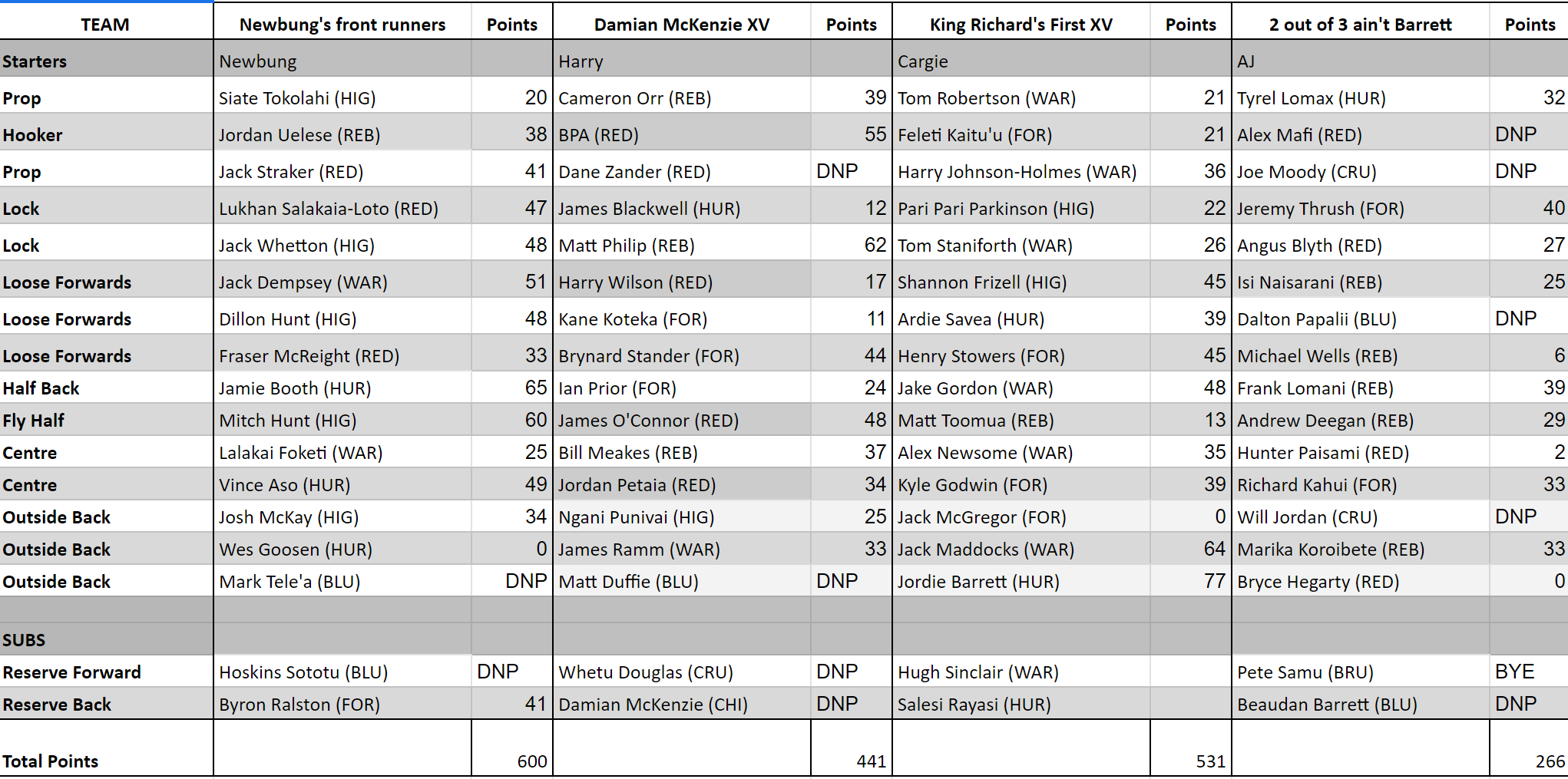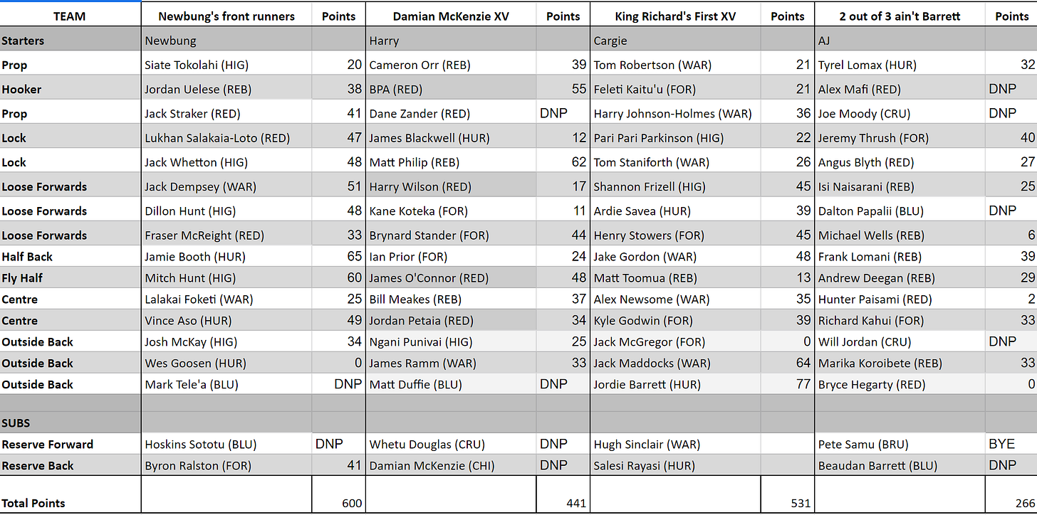 AJ was in the unique position of being a result (& a bit of luck) away from both a spot in the finals or that of the wooden spoon playoffs. What does one do in this position, well he hedged his bets and whilst making efforts to field a full side, he also took a calculated risk by trading in the Crusaders Will Jordan for a mainstay of his roster Jordie Barrett. If he couldn't get the win he wanted to make it harder for the one man, Nelson Dale, who could relegate AJ the spoon playoff with a victory of his own. AJ's team took the field without either of the Barrett brothers after which his team has been named and also just down a few men in general. After the Crusaders/Blues game was canned and Alex Mafi was pulled for the reds pregame, AJ ended up fielding only 11 men with a crack at fantasy points. I jested previously that Nelson knew he was in for a bad time when his top scorer was Michael Collins, well frankly that pales in comparison to AJ's top scorer being the 35 year old veteran, Jeremy Thrush with 40 points for the force. Frank Lomani with 39 was the only other score worth a shoutout in AJ's measly 266 total fantasy points, the 2nd lowest score for the week. Whilst despite the loss he'll be happy to have avoided the spoon playoffs, at 3 wins and 4 losses for the regular season, being one win off the finals illustrates just how close-fought this season of Draft Rugby was.