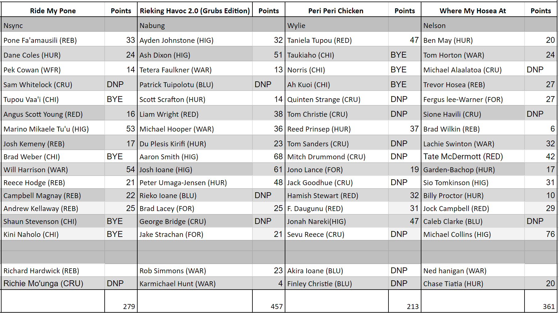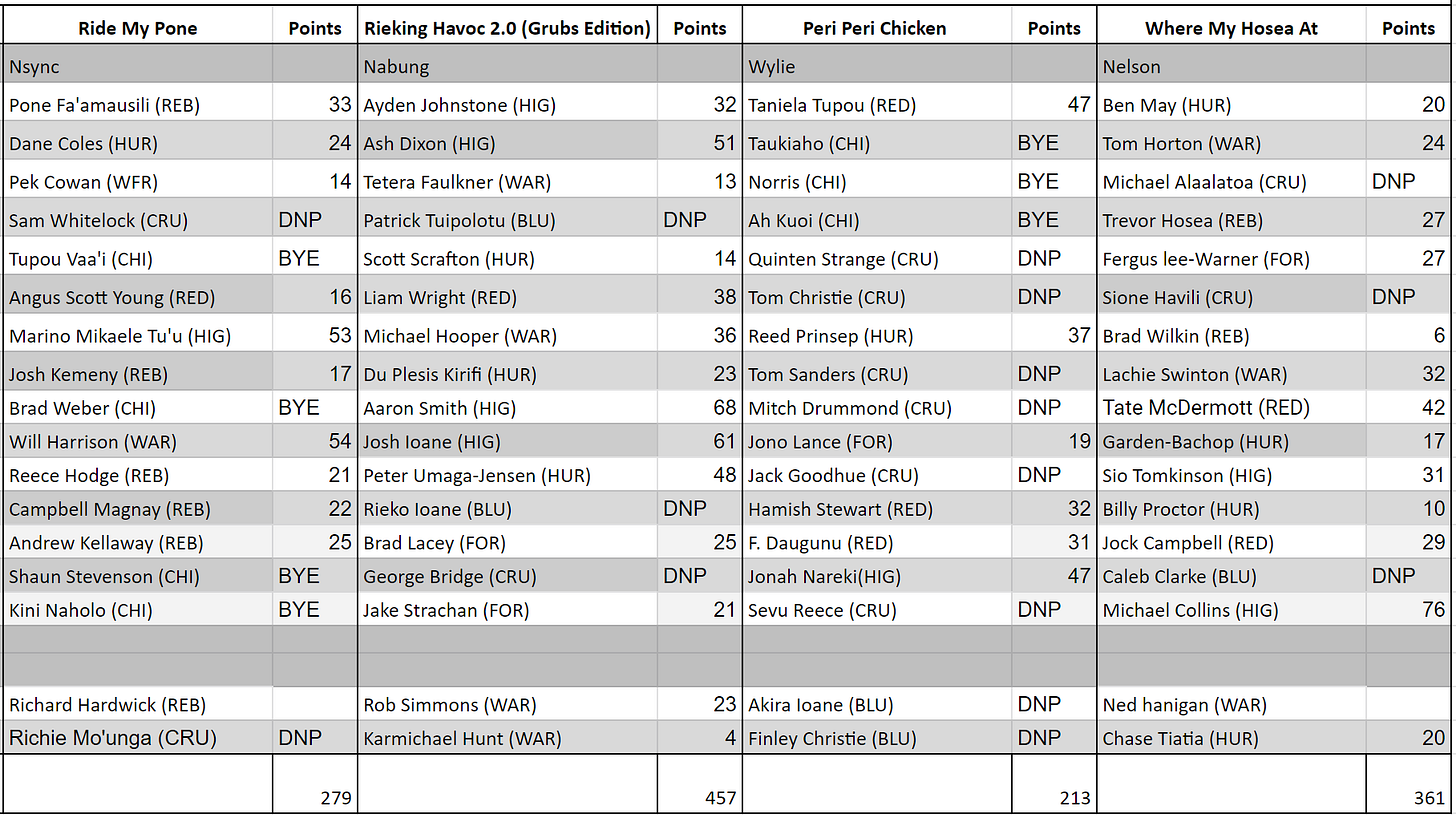 Nsync finished the 7 round regular season with a big fat doughnut, unable to muster a single win in his team's name in the Draft Rugby 2020 2.0 season. As a result of finishing bottom of the log, Sync will face the Draft Rugby 2020 punishment, keep an eye out for posts to come on that and in addition has booked himself a gig in the wooden spoon playoff. This is the playoff between the OG Leagues bottom two managers, the loser to have his name immortalised on the fabled wooden spoon trophy. In the weekends fixtures, Ride My Pone at least had name sake and fan favourite, Pone Fa'amausili back out there starting for the rebels and he scored 33 points in a colossal matchup with the Tongan Thor, Taniela Tupou, on the weekend. Whilst it can feel as though Pone is the size of a few players, Sync may have been a little carried away and only managed to field 10 men in this penultimate week's fixtures. His clear standouts were Will Harrison with 54 points and Marino Mikaele Tu'u with 53 both finishing the season strong.