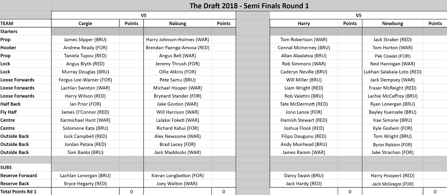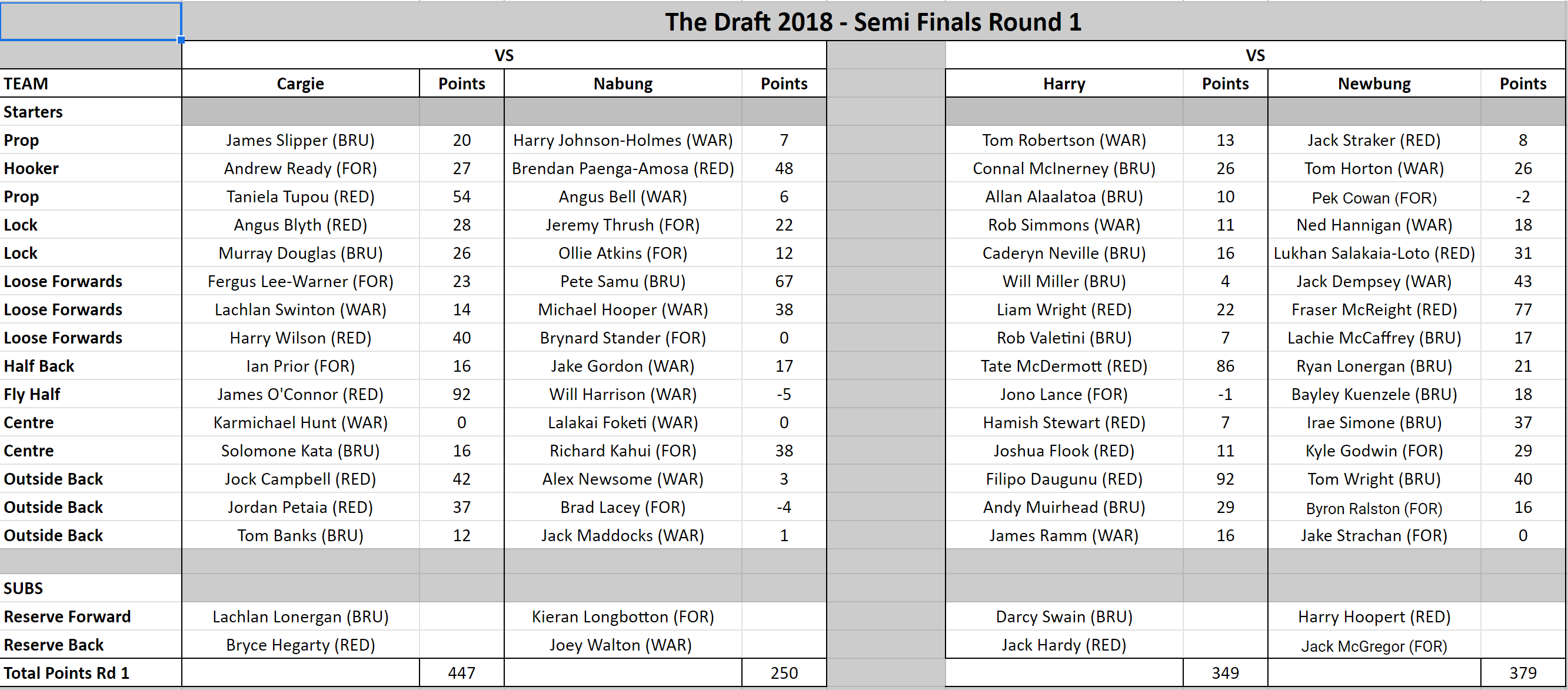Harry followed the same strategy of Cargie this week. However, picking from 2nd doesn't afford the same drafting privilege. As a result, he couldn't get as many of the top dogs. Filipo Daugunu (92 points) was a godsend for the side, having missed out on first choice Petaia (37) to Cargie. While first pick Tate McDermott (86) delivered exactly what was needed. A lack of other standout performers really hurt the Damian McKenzie XV, but the real low blow was losing both Reds centres Stewart (7) and Flook (11), who were surely destined to cash in on the Force thrashing. To top it off Jono Lance was dropped to the bench pregame having cut open his head, surely the bad luck can't strike two weeks in a row.