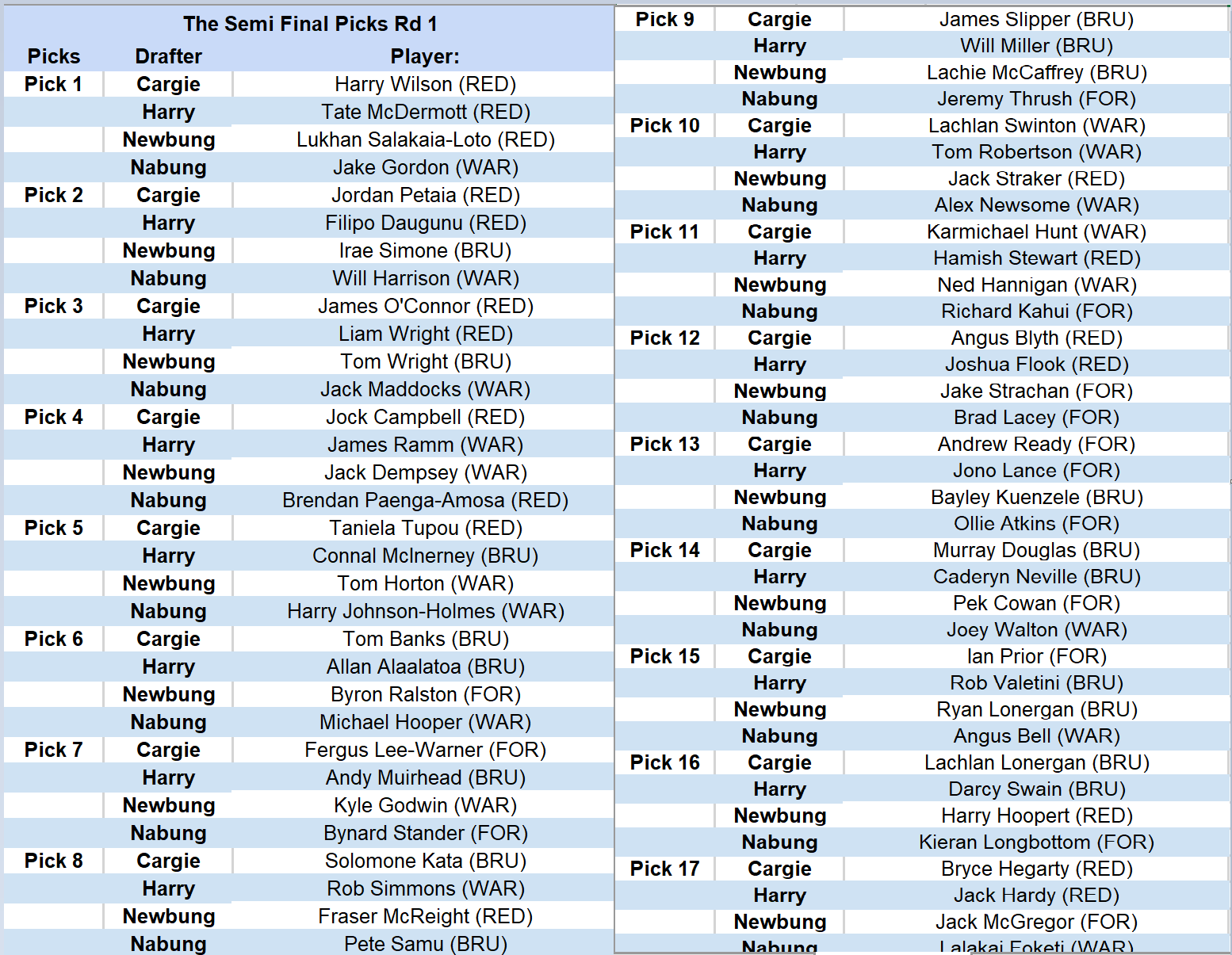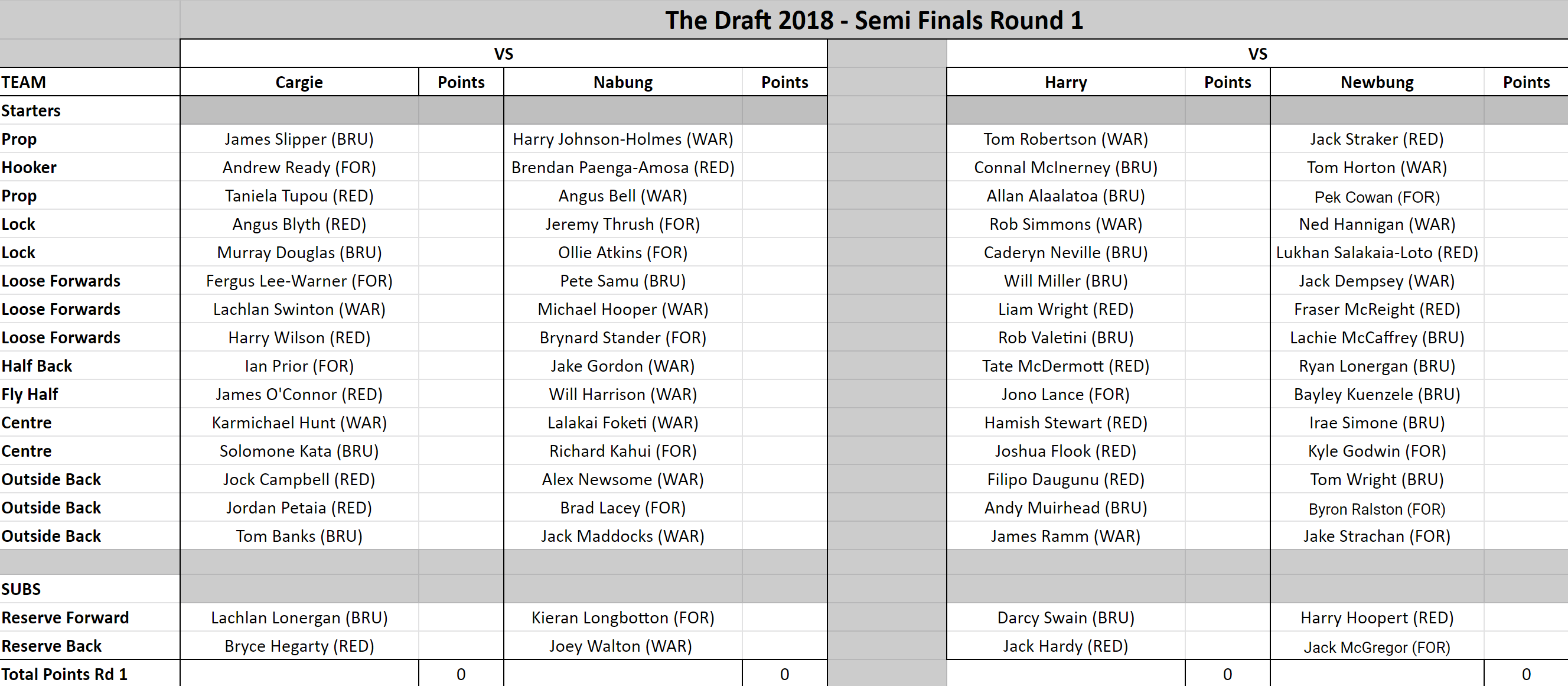 Our semi-finals are played over two consecutive weeks, with full sides redrafted for each round. We do this because there are fewer teams available, making the normal trade system impossible and because drafting is the greatest part of any fantasy footy competition.