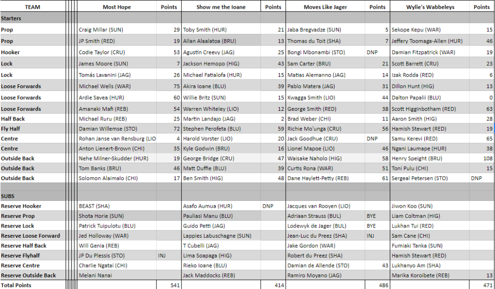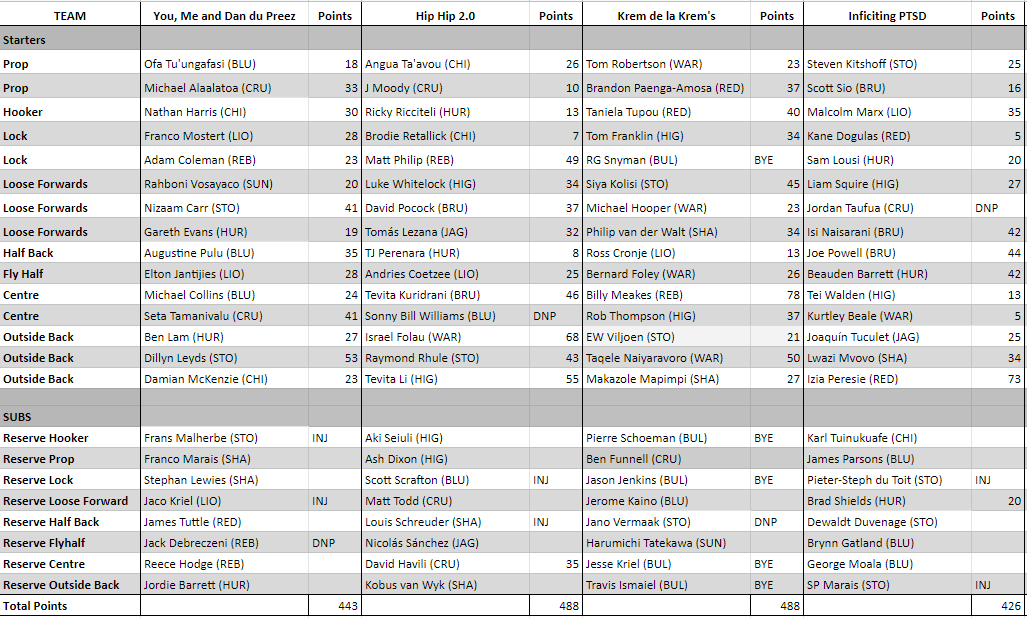 In 2018 all South African sides played in round 1, and all the other sides played in round 16. For this reason we merged these weeks into one match up with the normal five trades to account for mid season injuries.