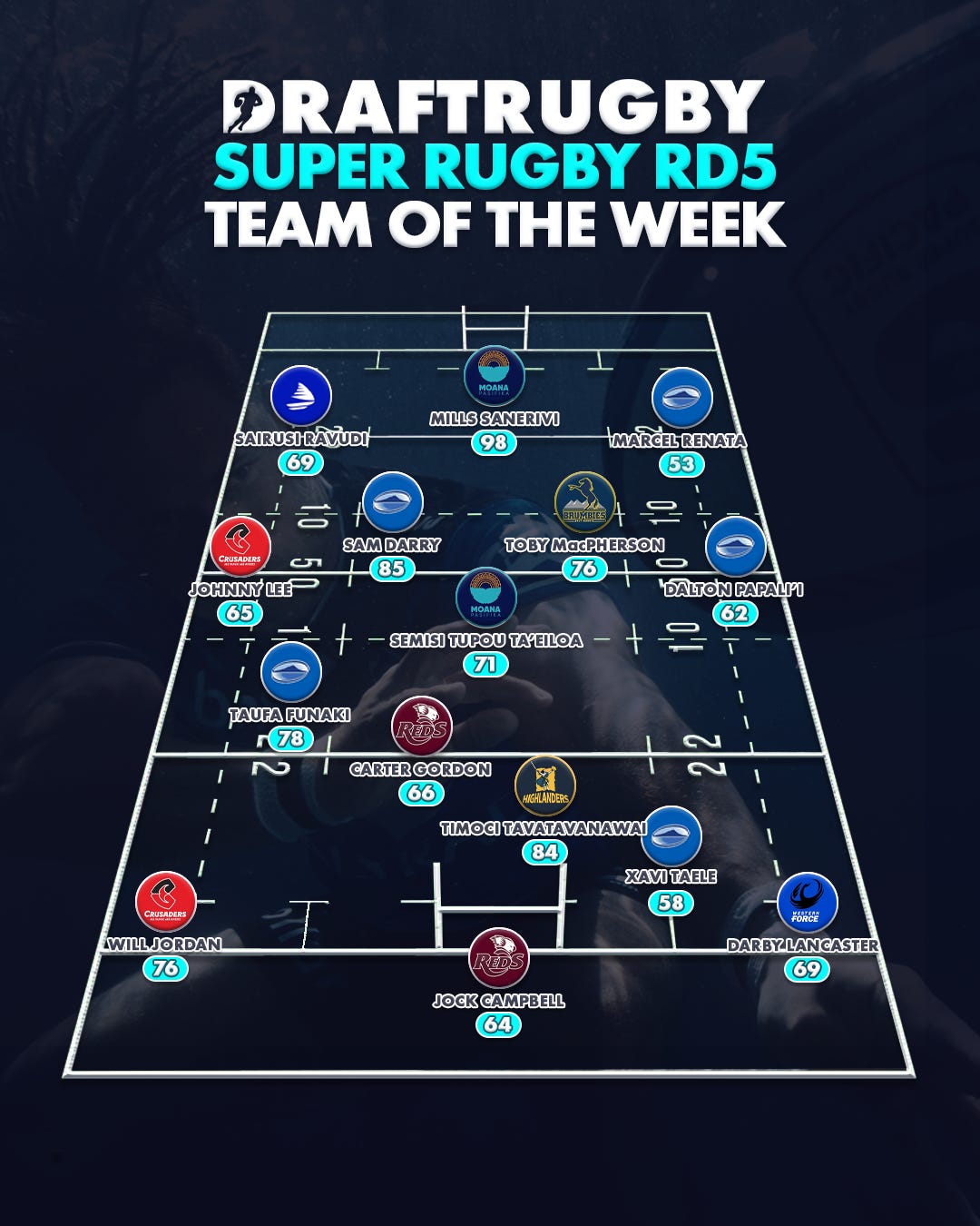 13: Xavi Taele – Centre, Blues (58 pts) The 21-year-old standout provided the stability the Blues needed in the midfield. 11 tackles and 2 turnovers won shows defensive grit that yields consistent points, while his 9 gain-line crosses kept Moana guessing all afternoon.