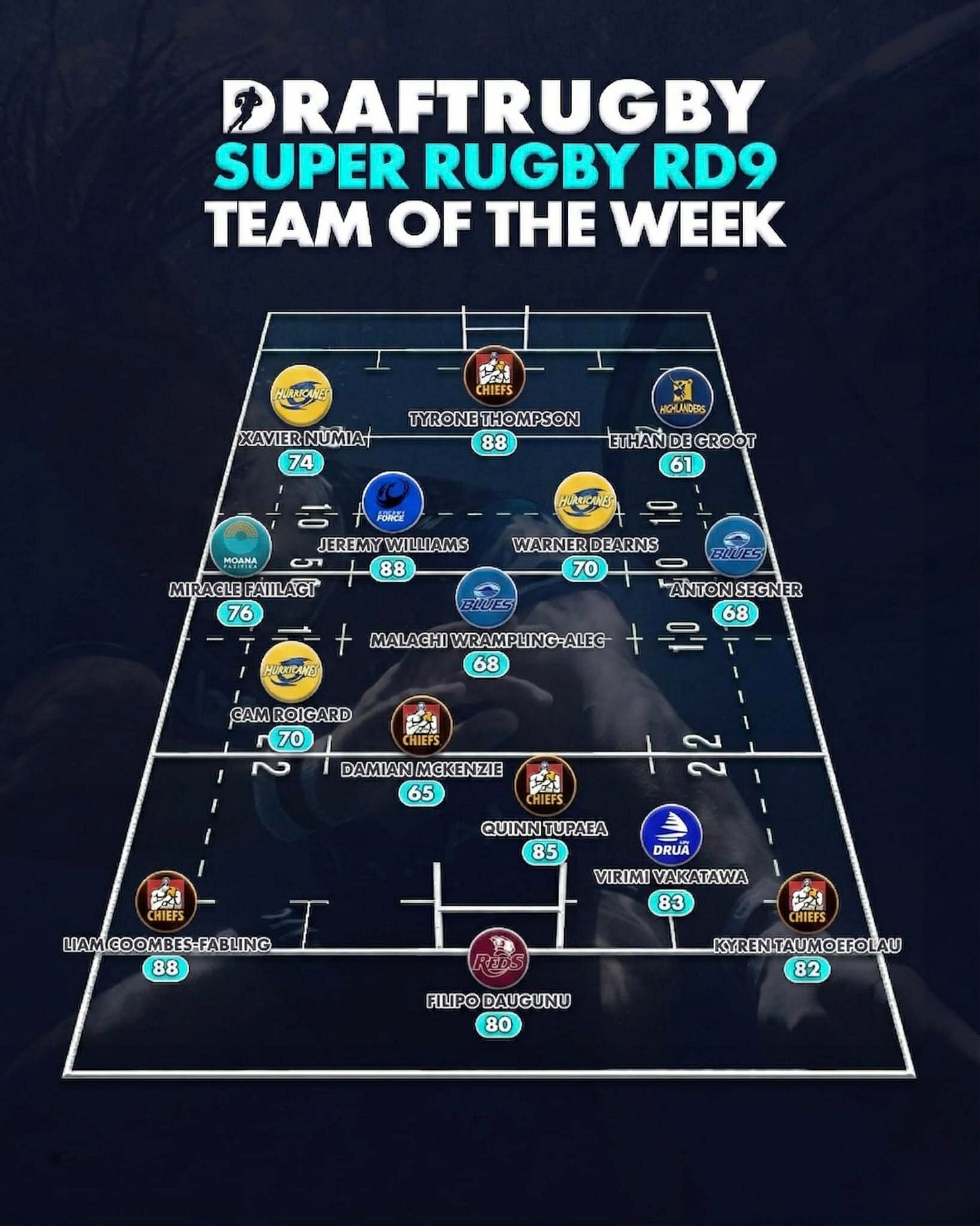 8: Malachi Wrampling-Alec – Back Row, Blues (68 pts) Malachi is officially experiencing a breakout campaign. Against a physical Hurricanes pack, he recorded 14 tackles and 7 tackle busts to go along with a well-earned try. His high involvement rate is quickly turning him into a mandatory starter.