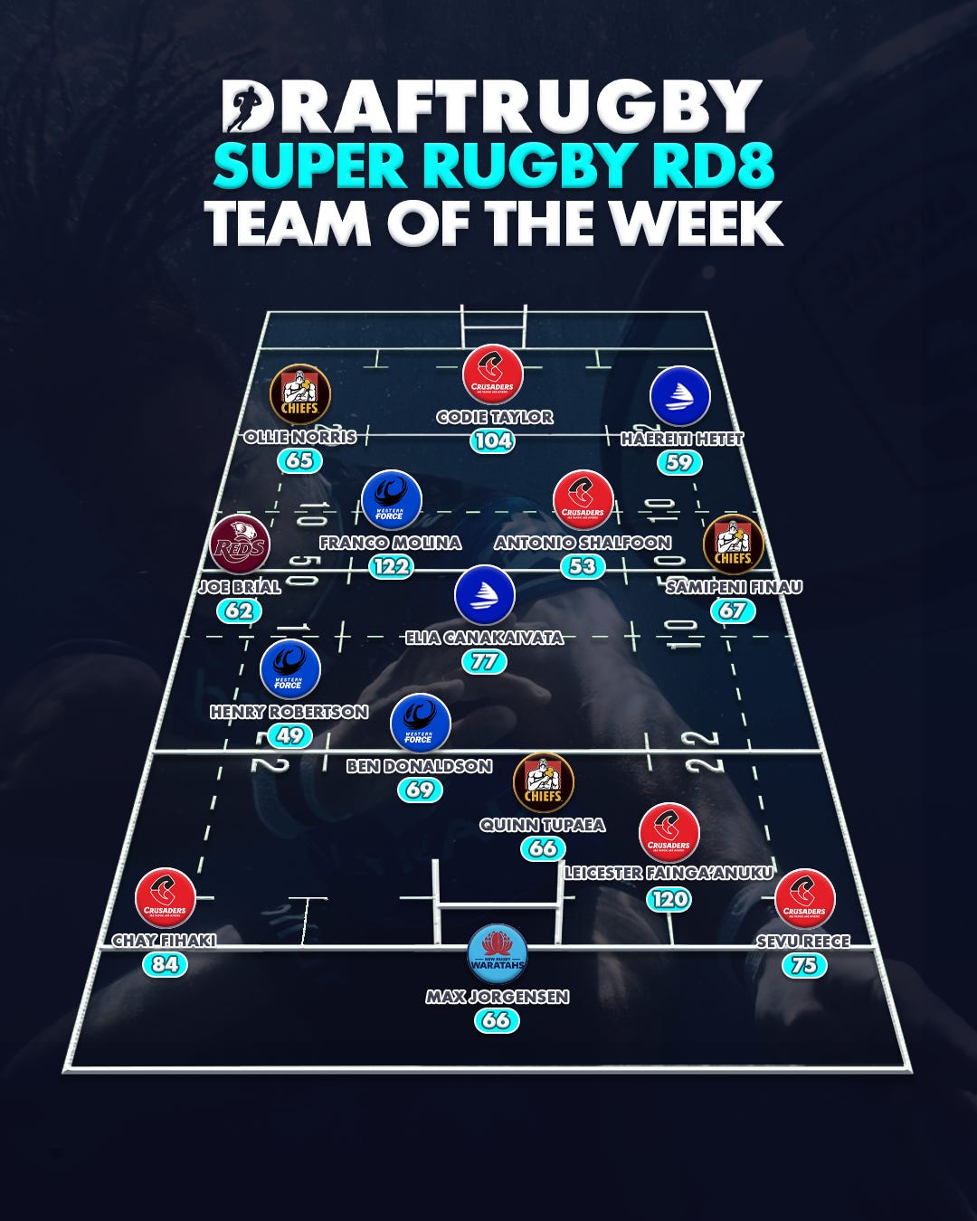 7: Samipeni Finau – Back Row, Chiefs (67 pts) Finau showcased his raw athleticism with two line breaks and 49 post-contact metres. His 23 ruck arrivals and 80-minute shift provided the consistent involvement Draft managers crave.