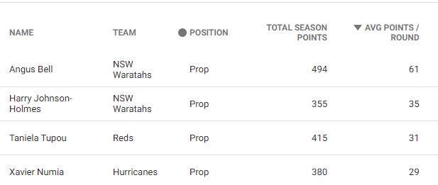 Angus Bell - "At the ripe age of 20, Bell will take his thrown as the Waratahs number 1 Loosehead prop". If you're thinking that was exactly what we said this time last year then you're dead right. I'm not sure how high stocks can go, but this man is a blue chip, potential number 1 overall pick. Just check out the leading prop scorers from 2021 below: