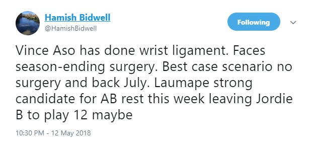 Reds Karmichael Hunt – He may be back from his drug trial but Thorn says he hasn't being attending training for the Reds or even club footy. It sounds like his season is as good as done. Source here. Lukhan Tui - Has a knee injury from Rd 9, going for surgery so should be out for a while. Source here. Caleb Timu - Ankle Syndesmosis sprain (high ankle sprain). Missed Rd 13 and is apparently unlikely to play Rd 14. Source here.