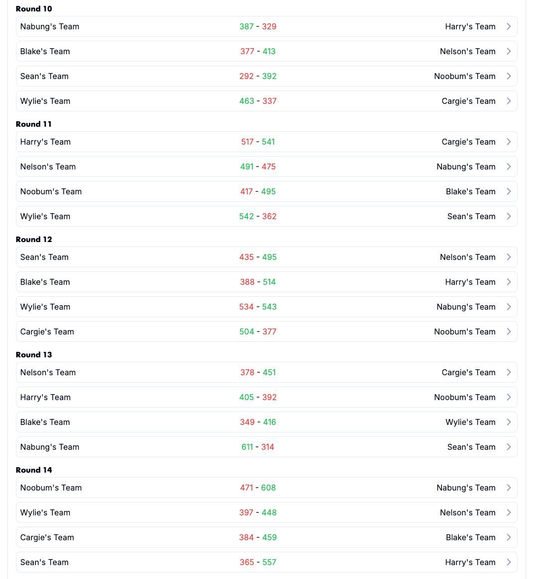 As as much as it pains me to write this, in 2025 we crowned a new champion, Nabung, who secured his first ever championship ring. The regular season was close fought to the final round with Nabung’s team topping the table with 58 competition points after a truly blockbusting season with 8143 total fantasy points. He was almost 1000 fantasy points clear of Wylie in second place with 7264 but only two competition points, Wylie finishing on 56.