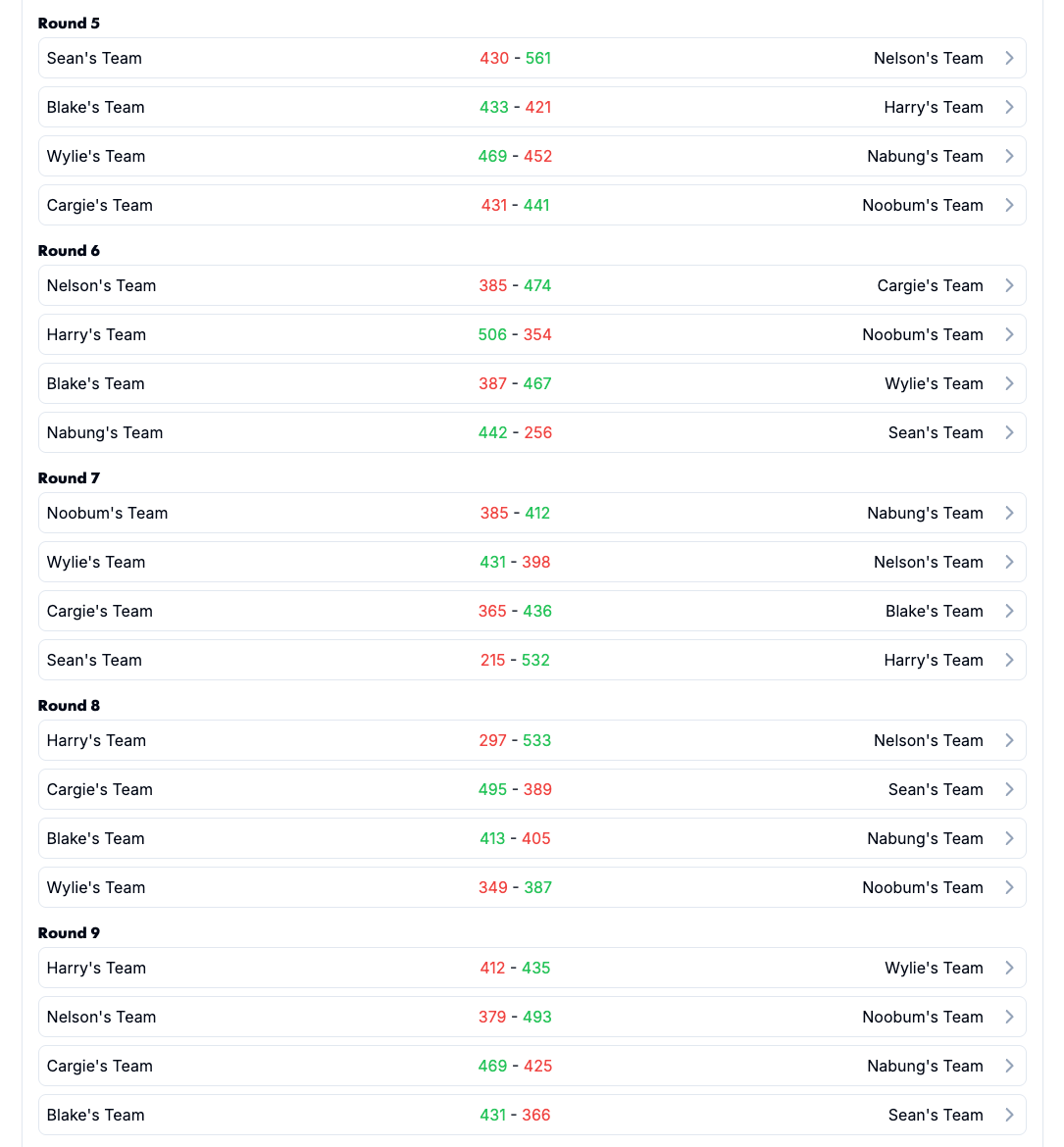 In the OG League the bottom of the table in the regular season does the punishment but to keep people playing in positions 6 & 7 on the table till the end of the season, we also run a wooden spoon final which is a 7th & 8th place playoff. Whilst he had a good crack, Sean ultimately lost the wooden spoon final to Blake 901-825 and so finished the year with both the league punishment and wooden spoon.
