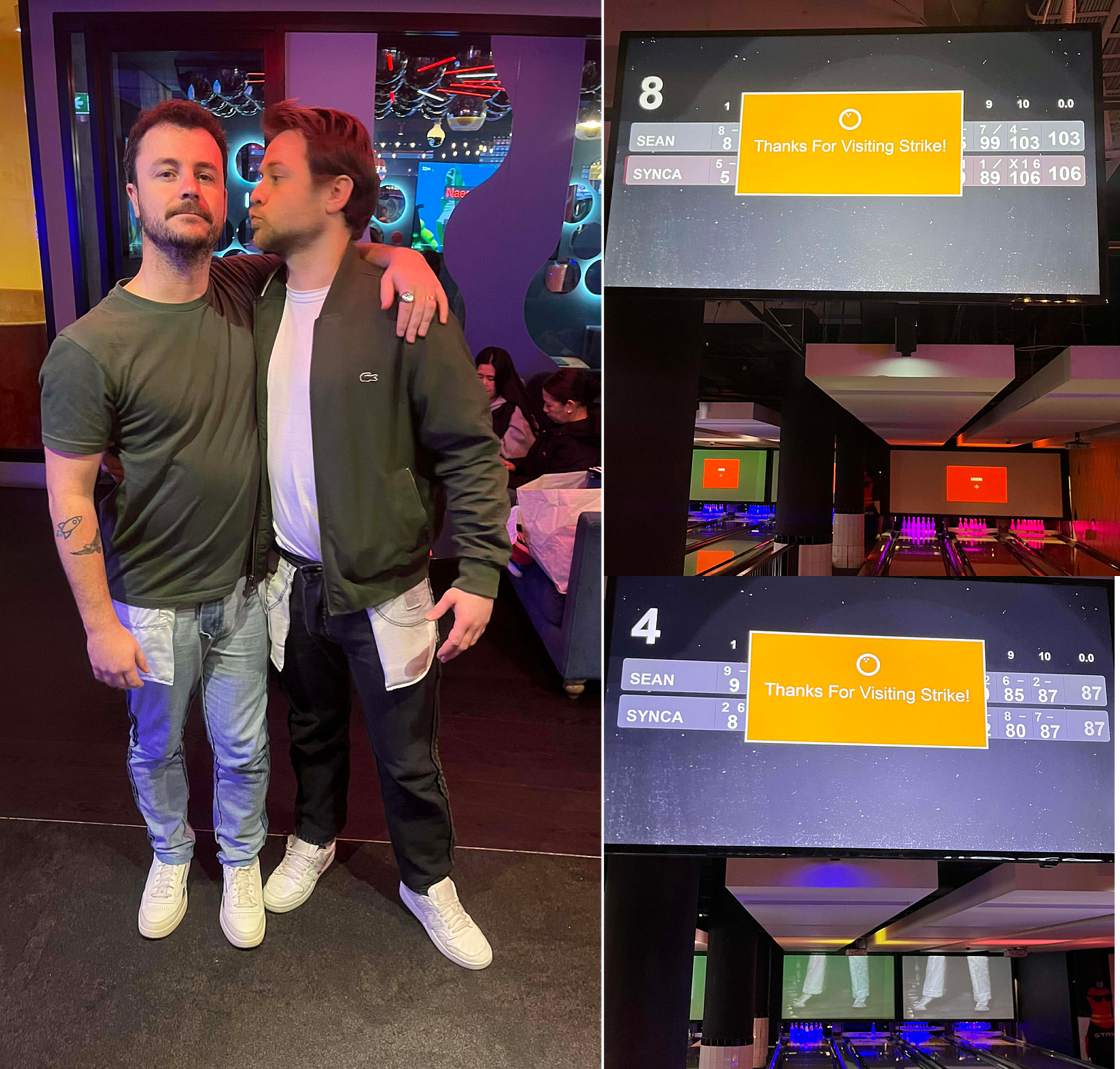 Sean opted for 5 beers and Justin 3 to get themselves going and I believe they scored just over 100 in their first game and we knew we were in for a rager. By the third game we started making new offers that would make all the difference and also ensure that we a) wouldn’t be there all day and b) wouldn’t get throw out. We offered that if they put their shoes on their opposite feet and turned their jeans inside out, we’d take another 15 pins off the total.