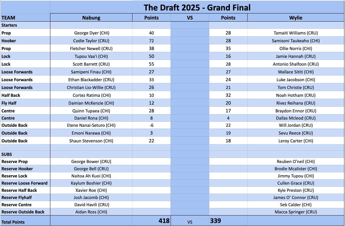 In our OG League finals series where 1 v 4 and 2 v 3, the top 2 Nabung & Wylie with first picks in their quarter finals re drafts dispatched off their opponents Harry and Cargie so that it was a true 1v2 in the Draft Rugby OG League Grand Final.