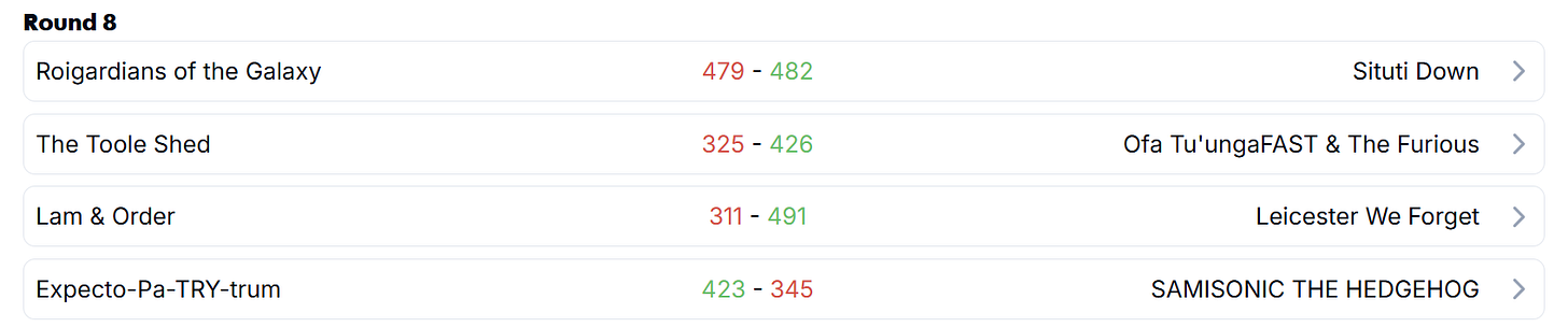 Result: 311 - 491 The “Order” was well and truly dismantled. Sean (Lam & Order) was hit harder by byes than anyone else, fielding a team that featured a combined zero from his backrow. The result came as no surprise though, with Sean chosing Bye-mageddon to build for the future, swooping on Finlay Christie and Isaac Henry to build his bench depth. Harry (Leicester We Forget) didn’t show any mercy, putting up a massive 491 points. The victory was anchored by a jaw-dropping 120 from Leicester Fainga’anuku and a clinical 84 from Chay Fihaki.