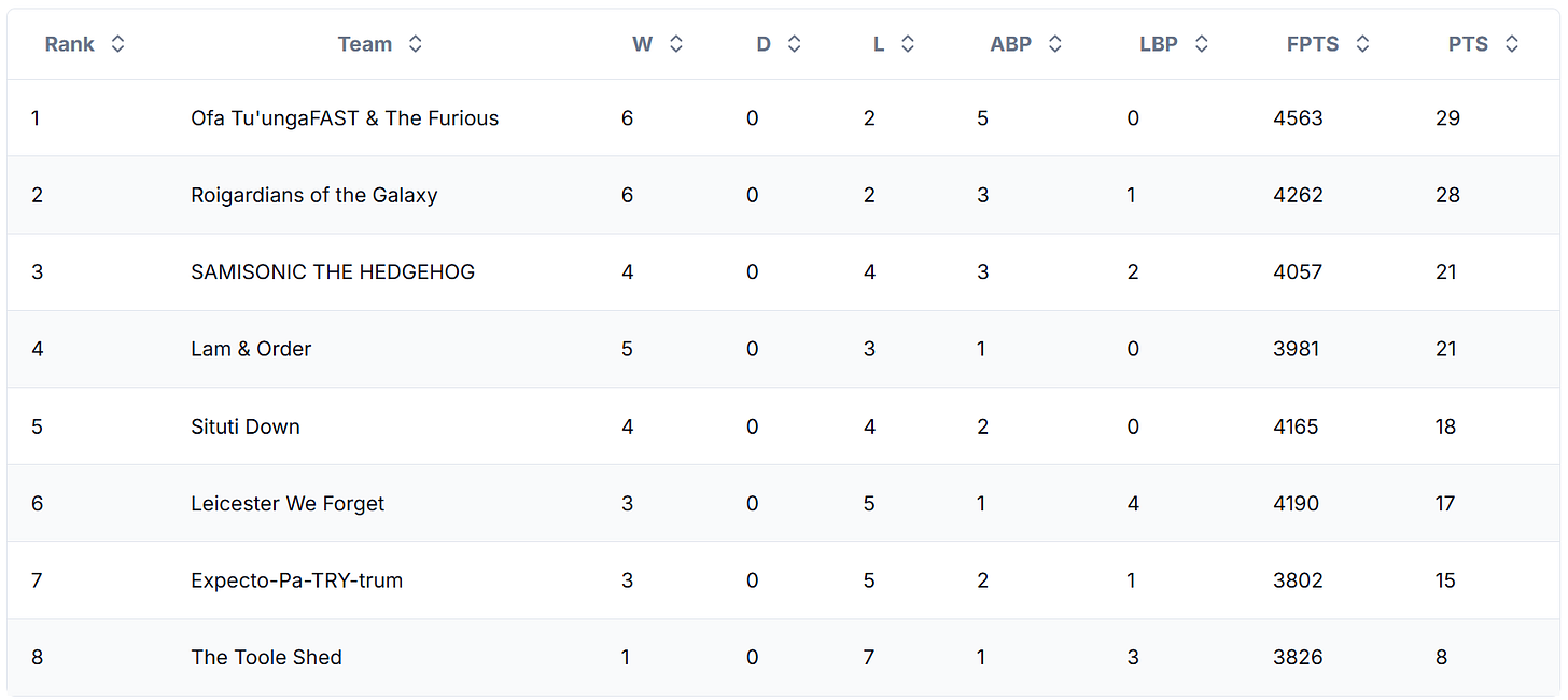 Blake is back on top of the table, but the top two are still a cut above. Sean and Nelson are losing ground to a surging Harry & Cargie. While Wylie remains 8th, but after such a chaotic round, the mid-table is wide open.