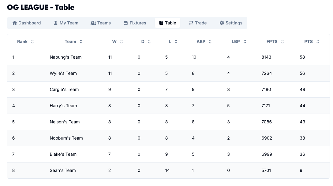 As as much as it pains me to write this, in 2025 we crowned a new champion, Nabung, securing his first ever championship ring. The regular season was close fought to the final round with Nabung topping the table with 58 competition points after a truly blockbusting season with 8143 total fantasy points. He was almost 1000 fantasy points clear of Wylie in second place with 7264 but only two competition points, Wylie finishing on 56. A coveted 4th place and finals berth was also contested into the final round where Cargie (48) & Harry (44) went through in 3rd and 4th respectively, Nelson missing out by one competition point on the table with 43, proving that those bonus points really do matter! Remember to play the man.