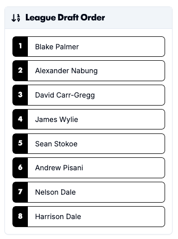 The draft order was decided in 2026 by each league member being randomly assigned a character in Super Smash Bros the game on nintendo and then set to a computer player at the highest settings for the computer played characters to battle in out in a royal rumble. First character eliminated resulted in the last (8th) draft pick and last standing was granted 1st.