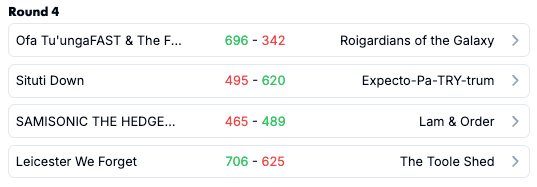 Andrew’s Expecto-Pa-TRY-trum (620) bounced back from a rough Round 3 to comfortably dispatch Cargie’s Situti Down (495). In a case of rocks or diamonds, Andrew’s men have had 2 shockers and 2 huge weeks! Cargie mainly shockers this far into the season but in his typical style is building for the future.